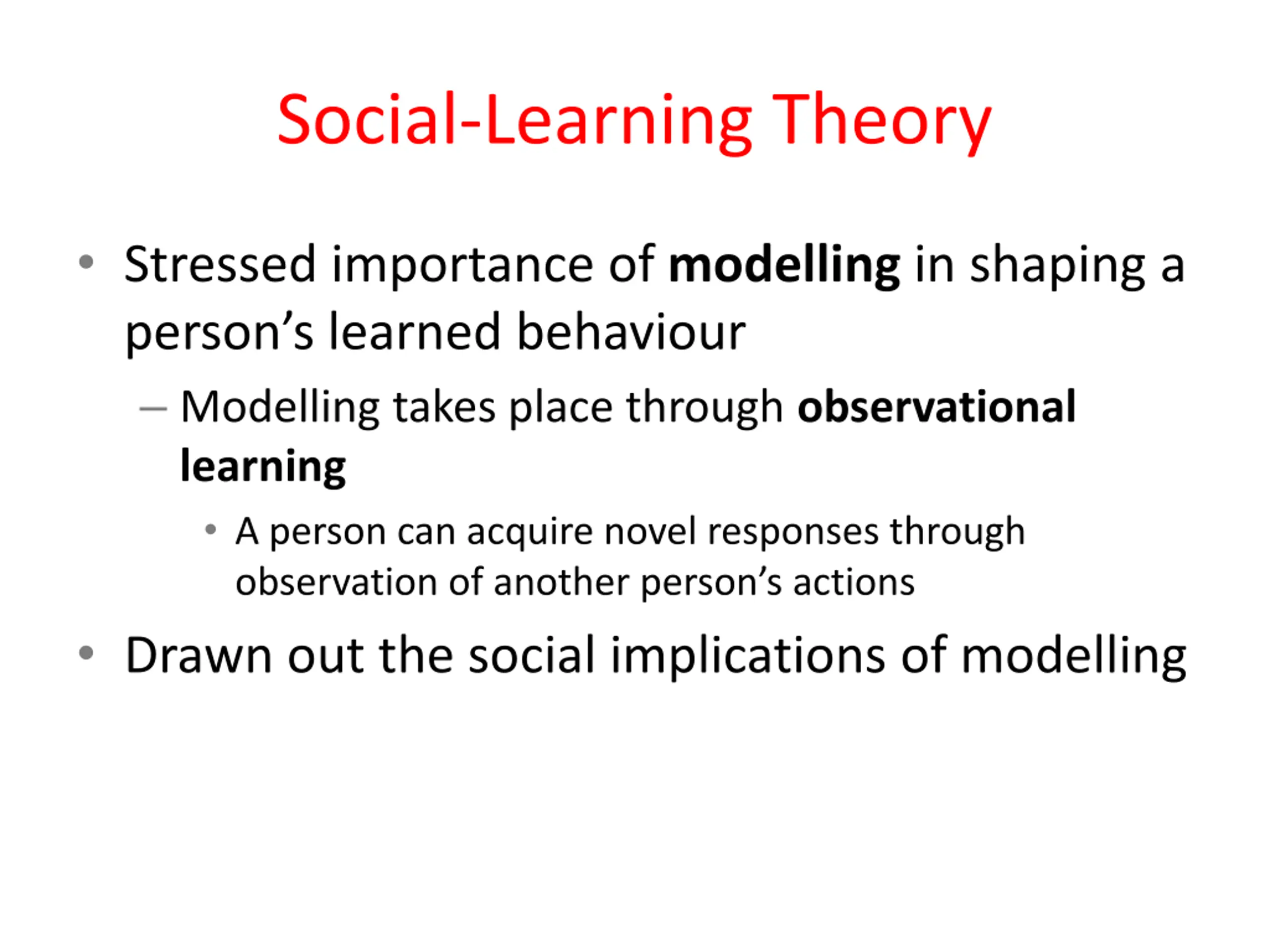Social-Learning Theory Stressed importance of modelling in shaping a person s learned behaviour Modelling takes place through observational learning A person can acquire novel responses through observation of another person s actions Drawn out the social implications of modelling