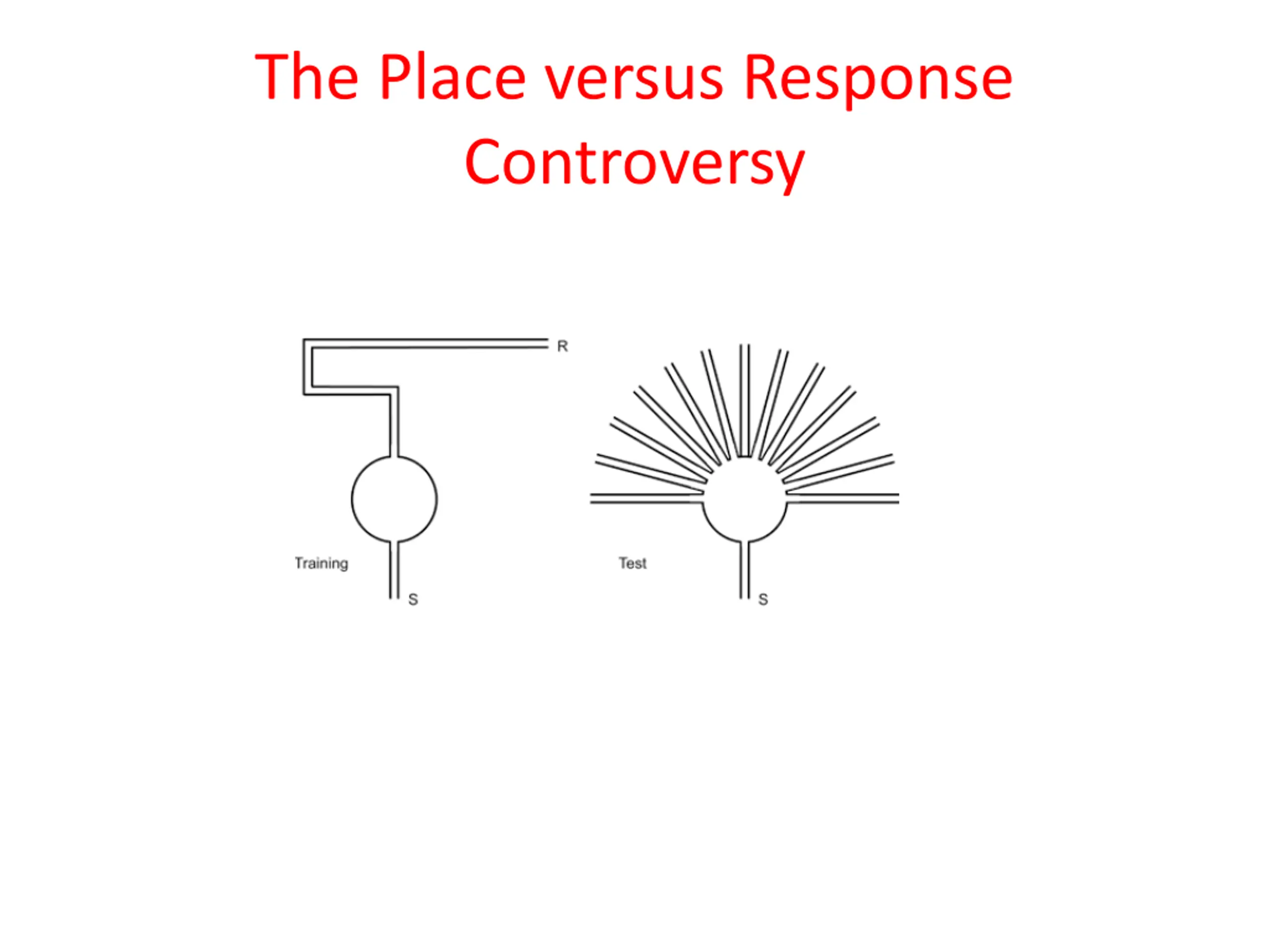 The Place versus Response Controversy Does learning consist of the formation of stimulus-response connections? If so, animals would learn specific responses to specific stimuli Does learning consist of the formation of expectations? If so, animals would learn a cognitive map that contains representations of themselves in relation to various aspects of their environment