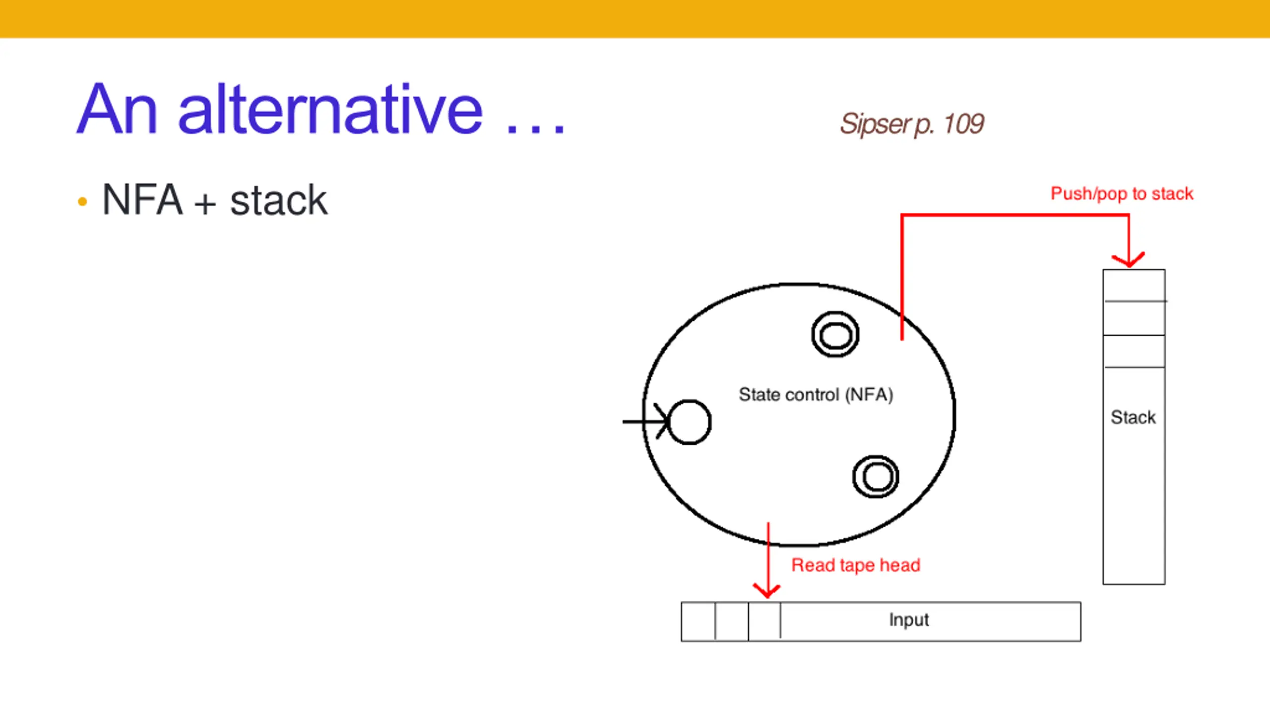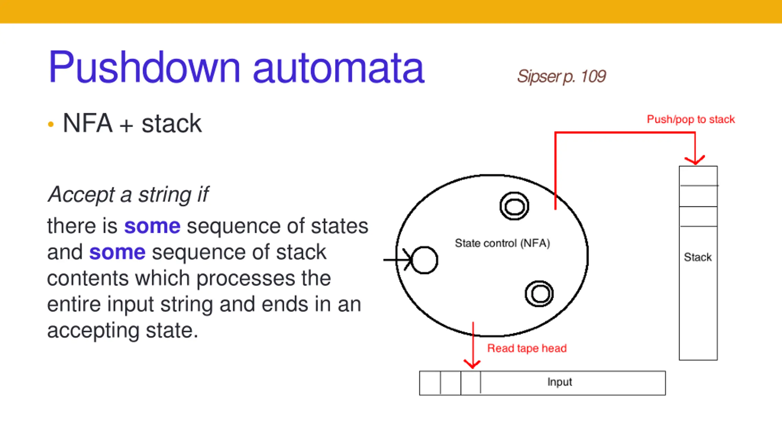 Pushdown automata Sipser p. 109 NFA + stack Accept a string if there is some sequence of states and some sequence of stack contents which processes the entire input string and ends in an accepting state.