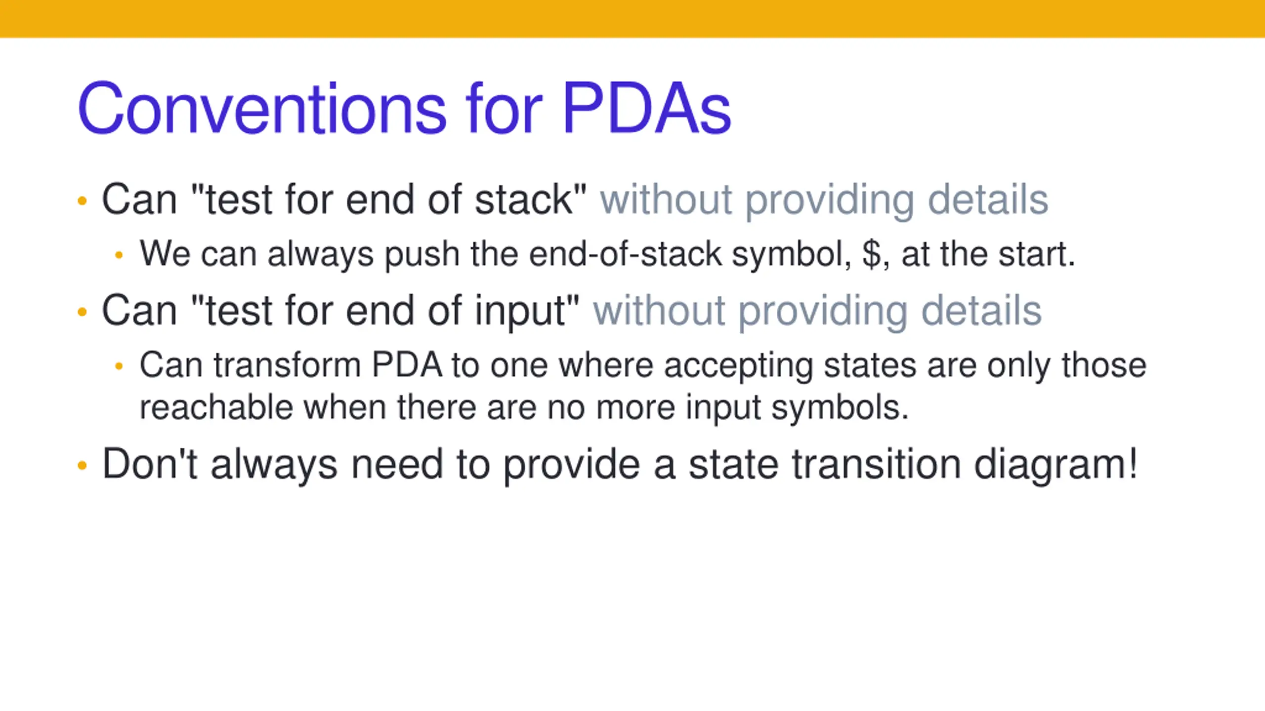 Conventions for PDAs Can "test for end of stack" without providing details We can always push the end-of-stack symbol, $, at the start. Can "test for end of input" without providing details Can transform PDA to one where accepting states are only those reachable when there are no more input symbols. Don't always need to provide a state transition diagram!