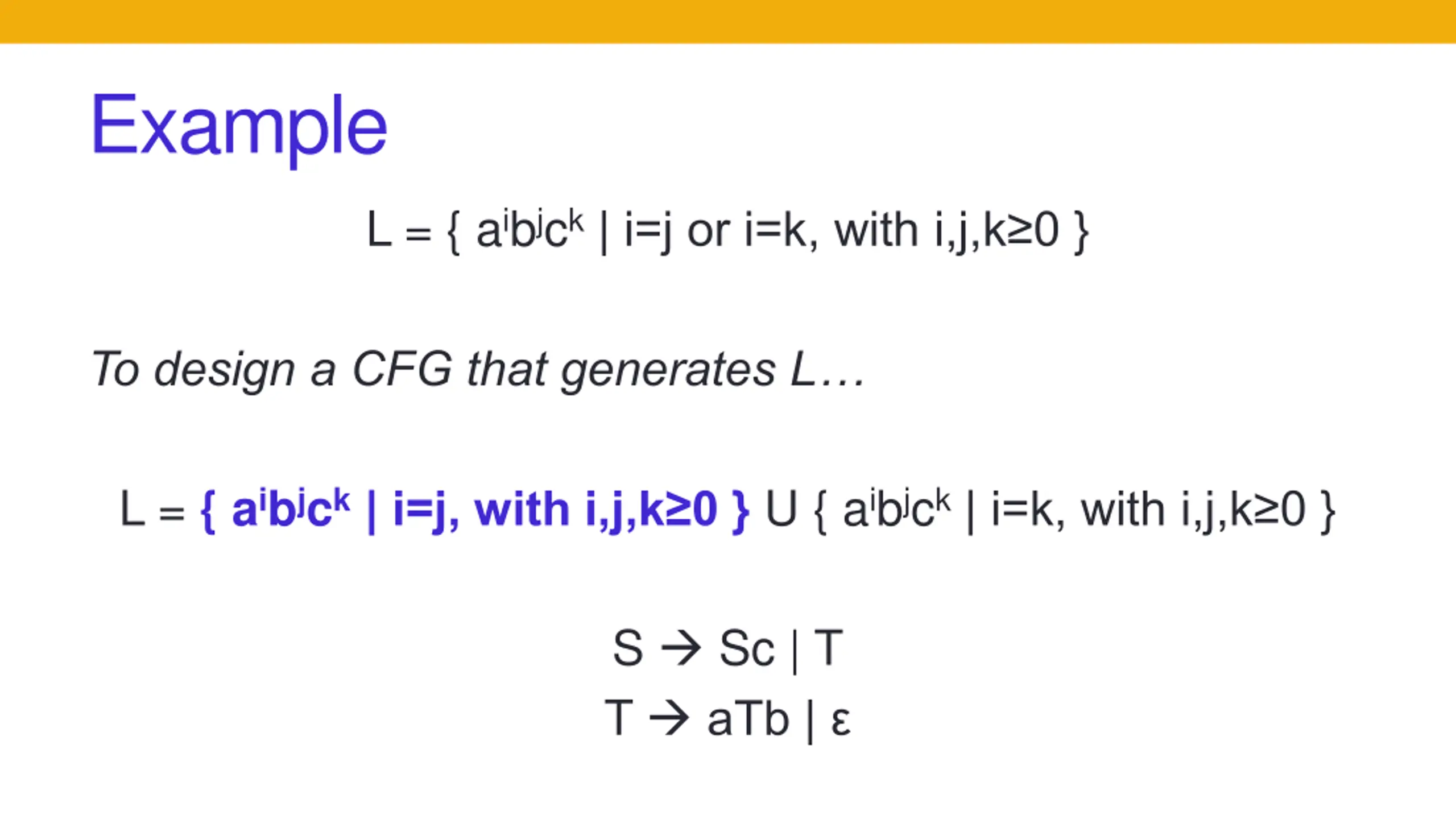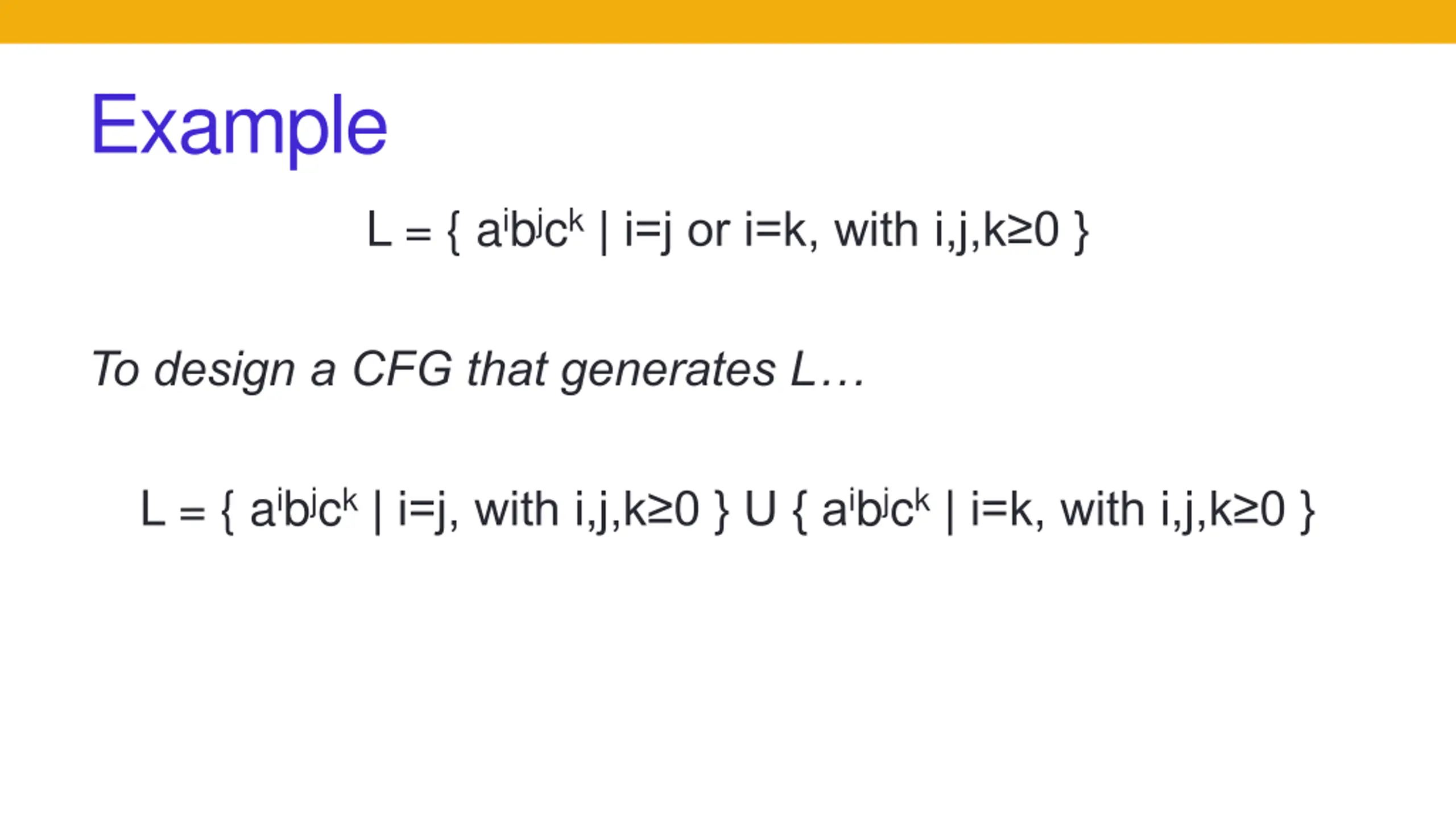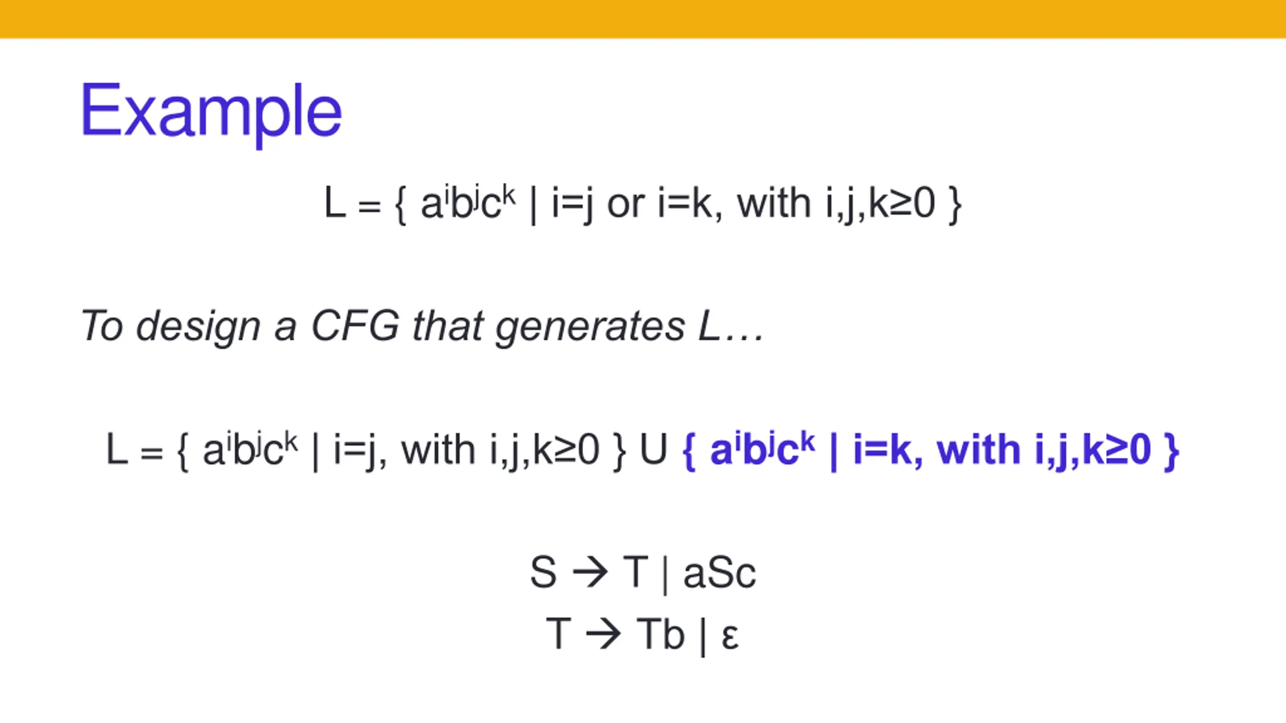 Example L = { aibjck| i=j or i=k, with i,j,k 0 } To design a CFG that generates L L = { aibjck| i=j, with i,j,k 0 } U { aibjck| i=k, with i,j,k 0 }