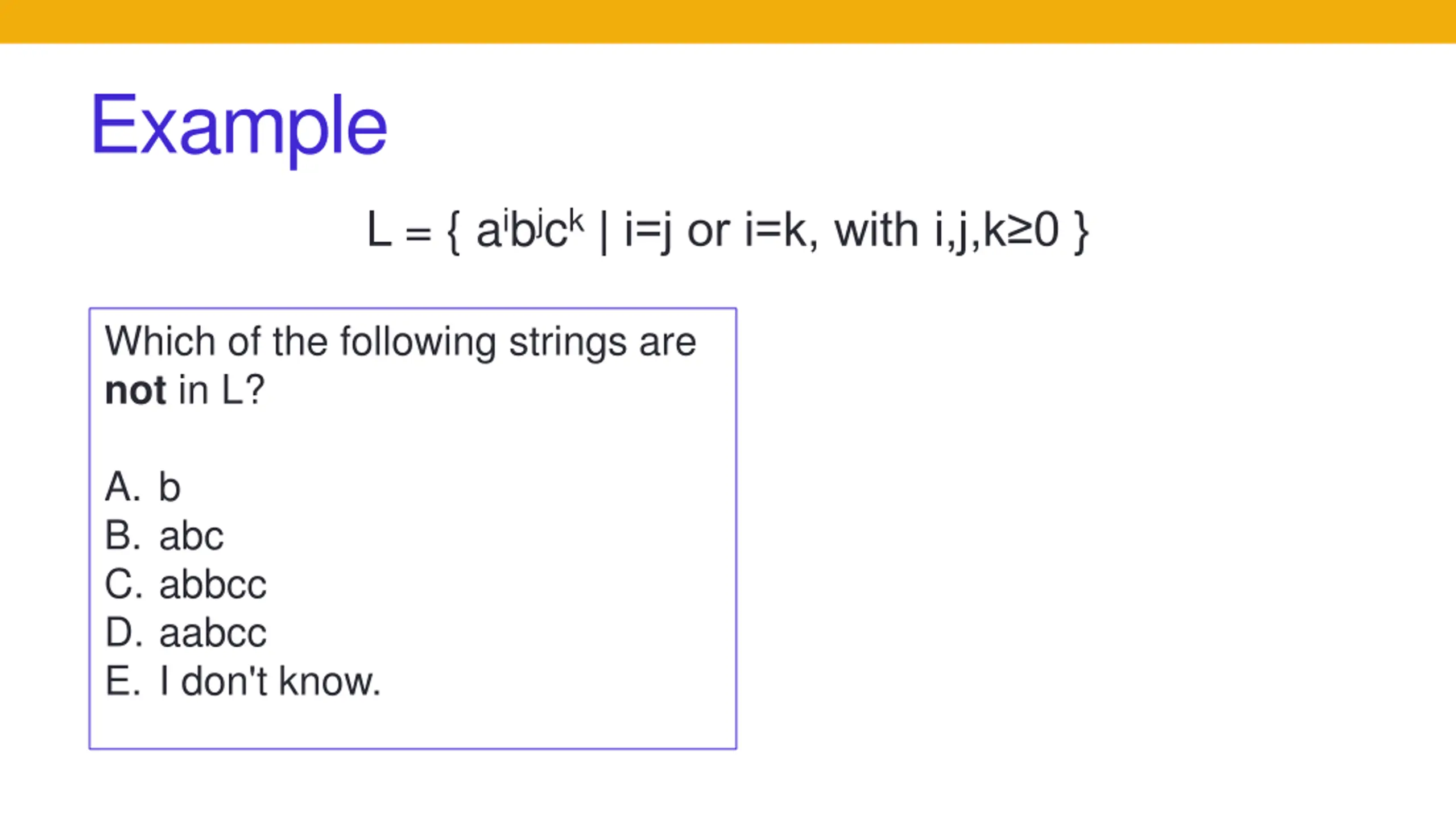 Example L = { aibjck| i=j or i=k, with i,j,k 0 } Which of the following strings are not in L? A. b B. abc C. abbcc D. aabcc E. I don't know.