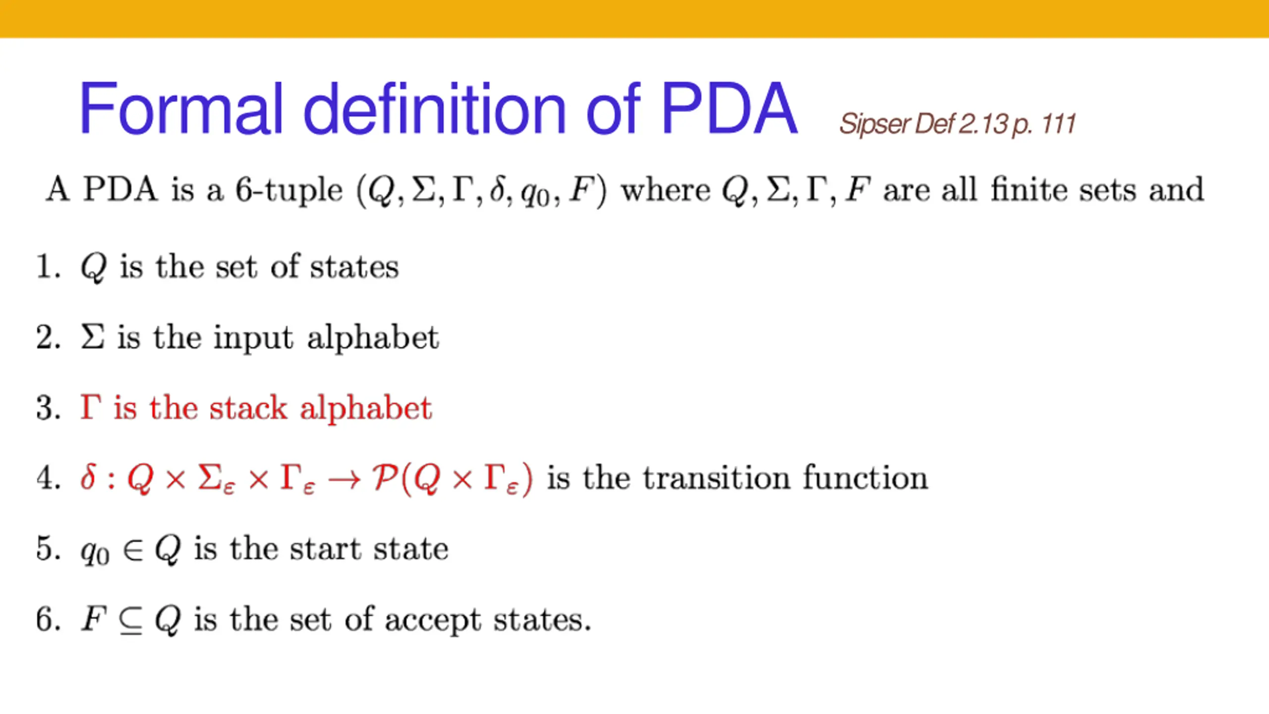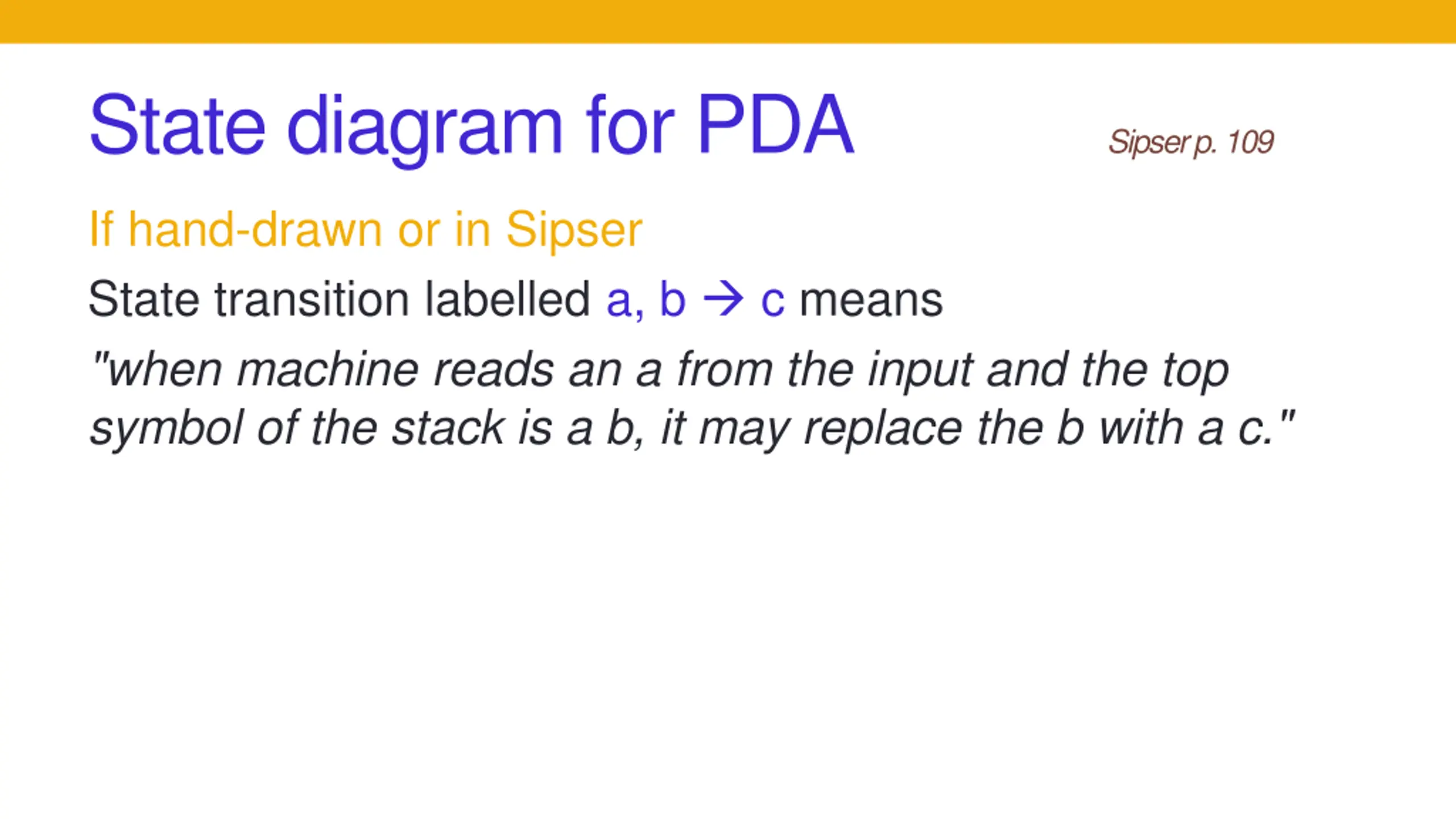 State diagram for PDA Sipser p. 109 If hand-drawn or in Sipser State transition labelled a, b c means "when machine reads an a from the input and the top symbol of the stack is a b, it may replace the b with a c."