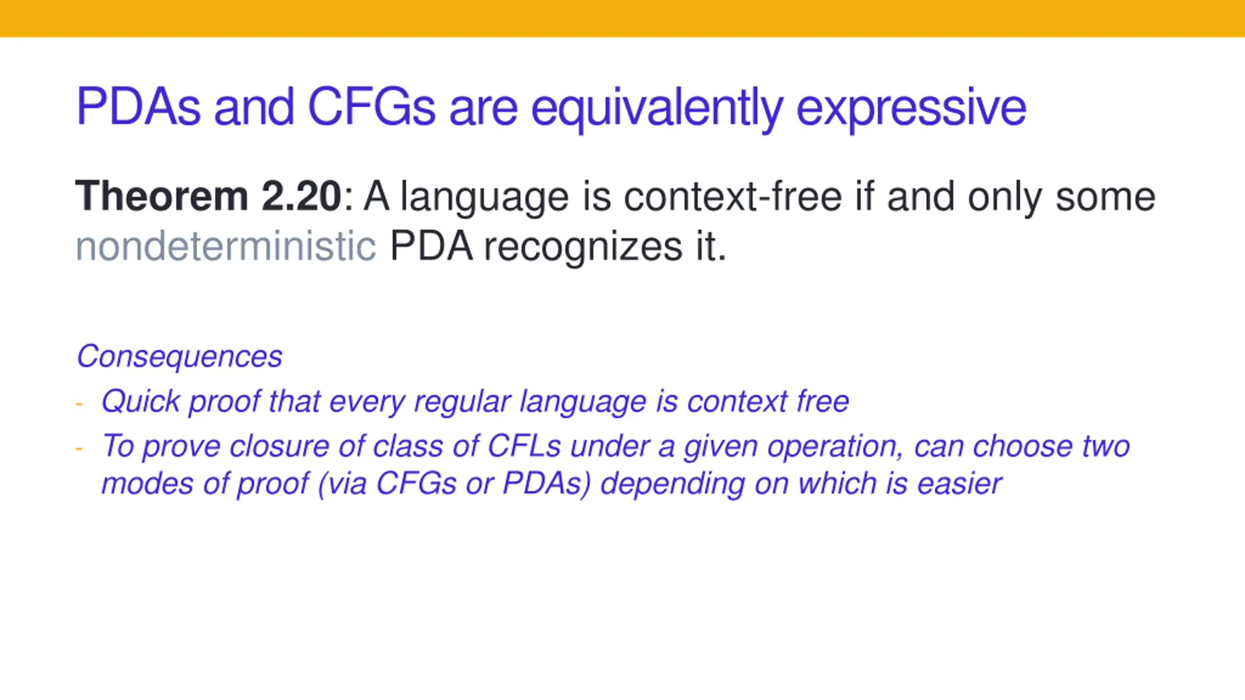 PDAs and CFGs are equivalently expressive Theorem 2.20: A language is context-free if and only some nondeterministicPDA recognizes it. Consequences - Quick proof that every regular language is context free - To prove closure of class of CFLs under a given operation, can choose two modes of proof (via CFGs or PDAs) depending on which is easier