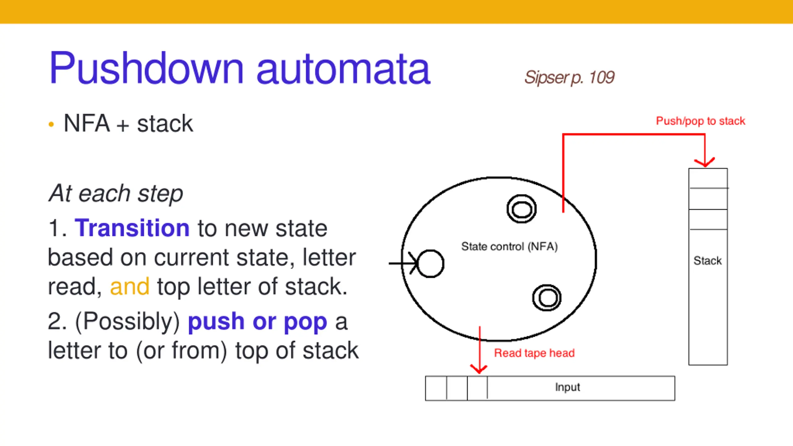 Pushdown automata Sipser p. 109 NFA + stack At each step 1. Transition to new state based on current state, letter read, and top letter of stack. 2. (Possibly) push or pop a letter to (or from) top of stack