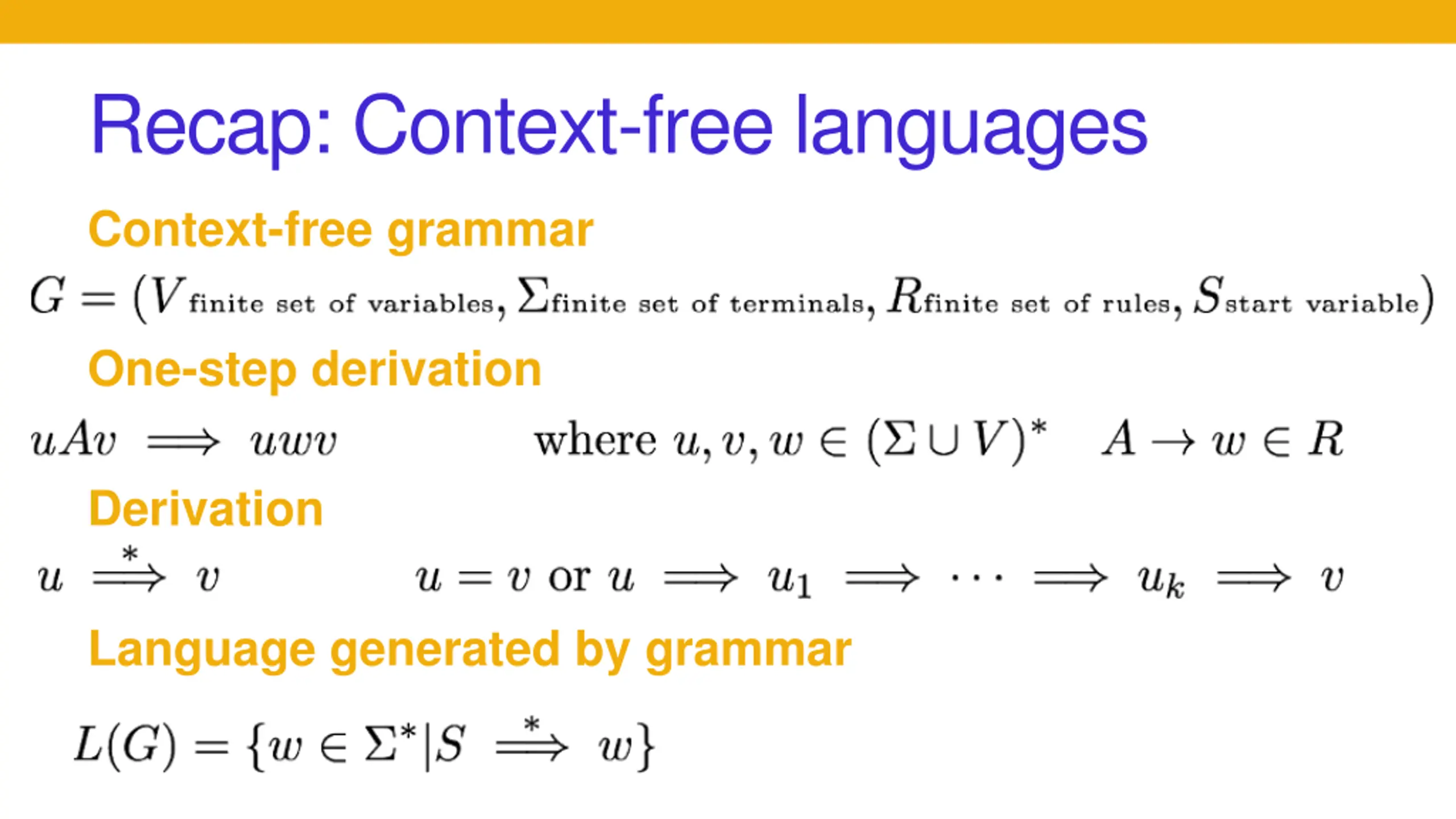 Recap: Context-free languages Context-free grammar One-step derivation Derivation Language generated by grammar