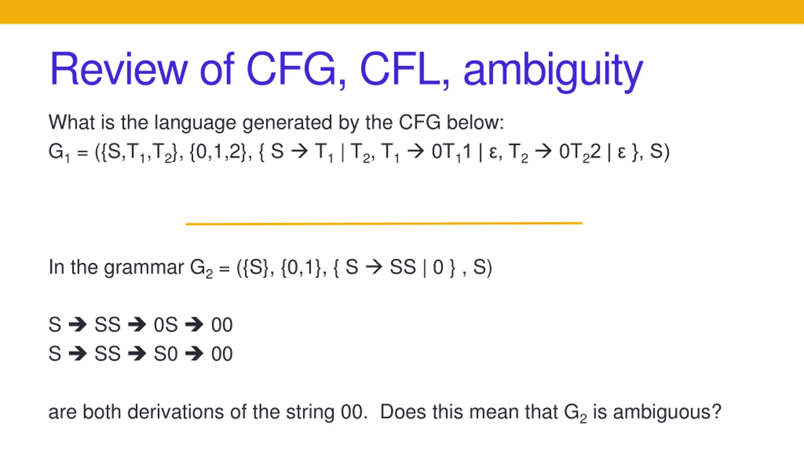 Review of CFG, CFL, ambiguity What is the language generated by the CFG below: G1= ({S,T1,T2}, {0,1,2}, { S T1| T2, T1 0T11 | , T2 0T22 | }, S) In the grammar G2= ({S}, {0,1}, { S SS | 0 } , S) S SS 0S 00 S SS S0 00 are both derivations of the string 00. Does this mean that G2is ambiguous?