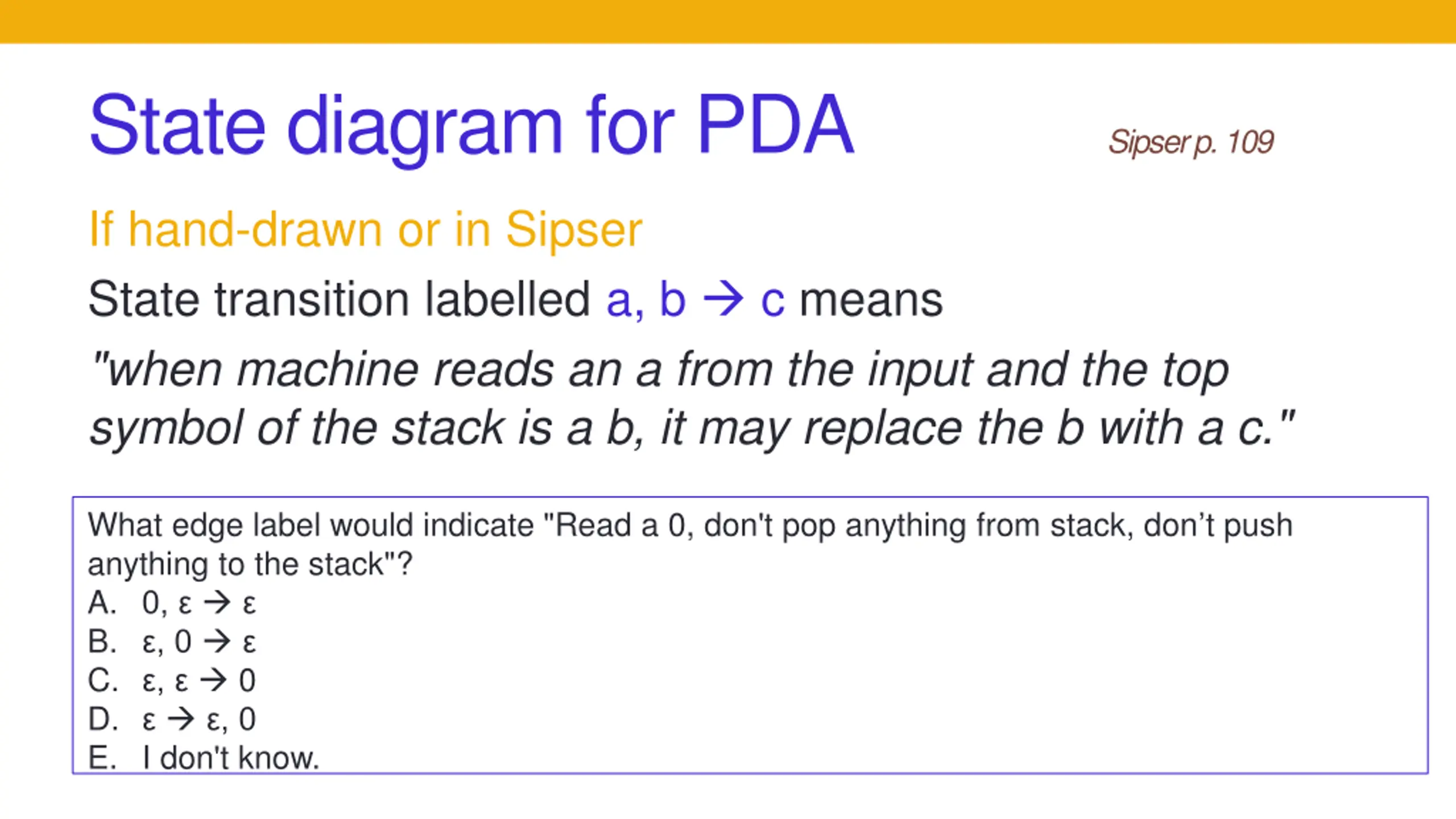 State diagram for PDA Sipser p. 109 If hand-drawn or in Sipser State transition labelled a, b c means "when machine reads an a from the input and the top symbol of the stack is a b, it may replace the b with a c." What edge label would indicate "Read a 0, don't pop anything from stack, don t push anything to the stack"? A. 0, B. , 0 C. , 0 D. , 0 E. I don't know.