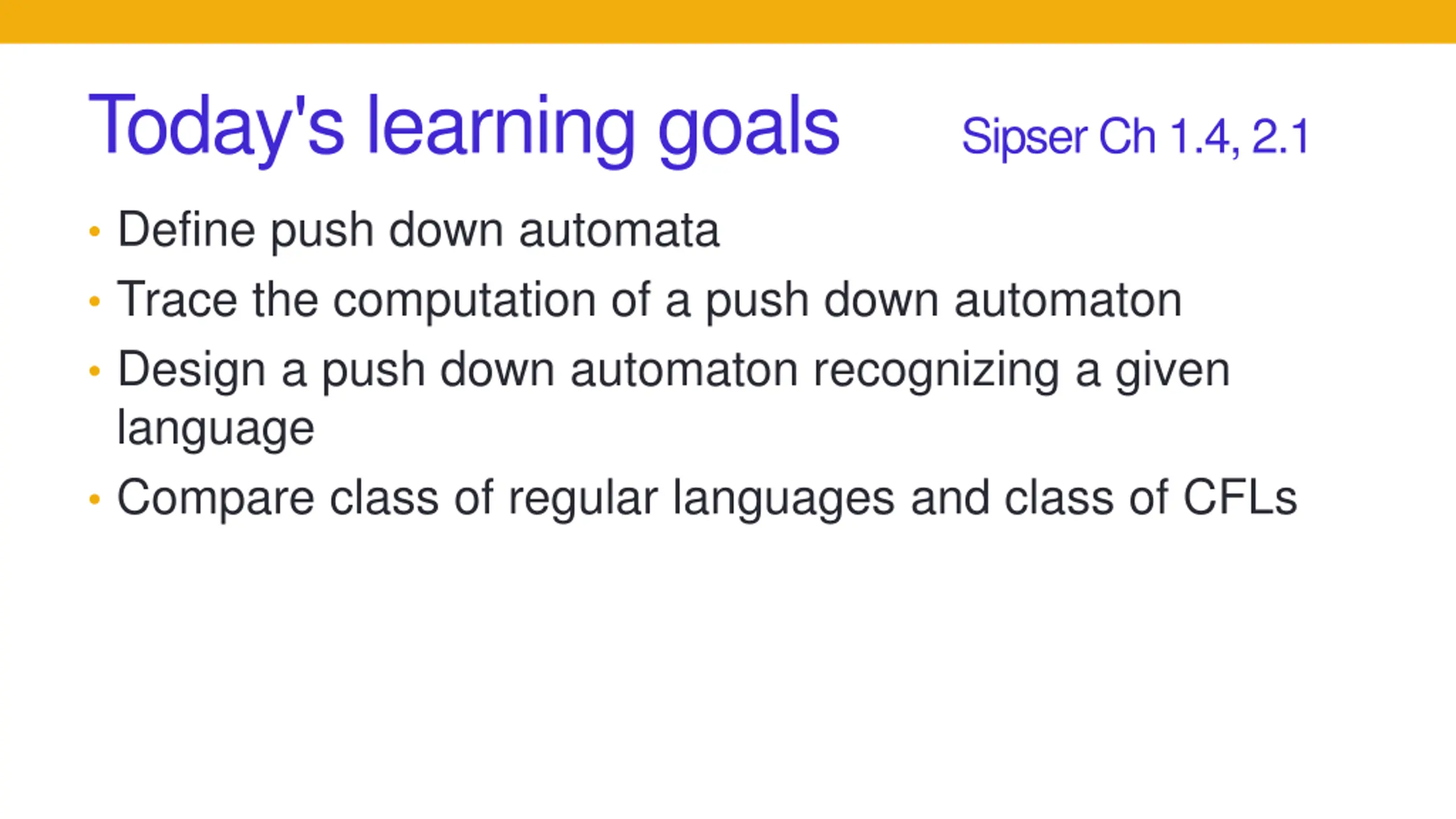 Today's learning goals Sipser Ch 1.4, 2.1 Define push down automata Trace the computation of a push down automaton Design a push down automaton recognizing a given language Compare class of regular languages and class of CFLs