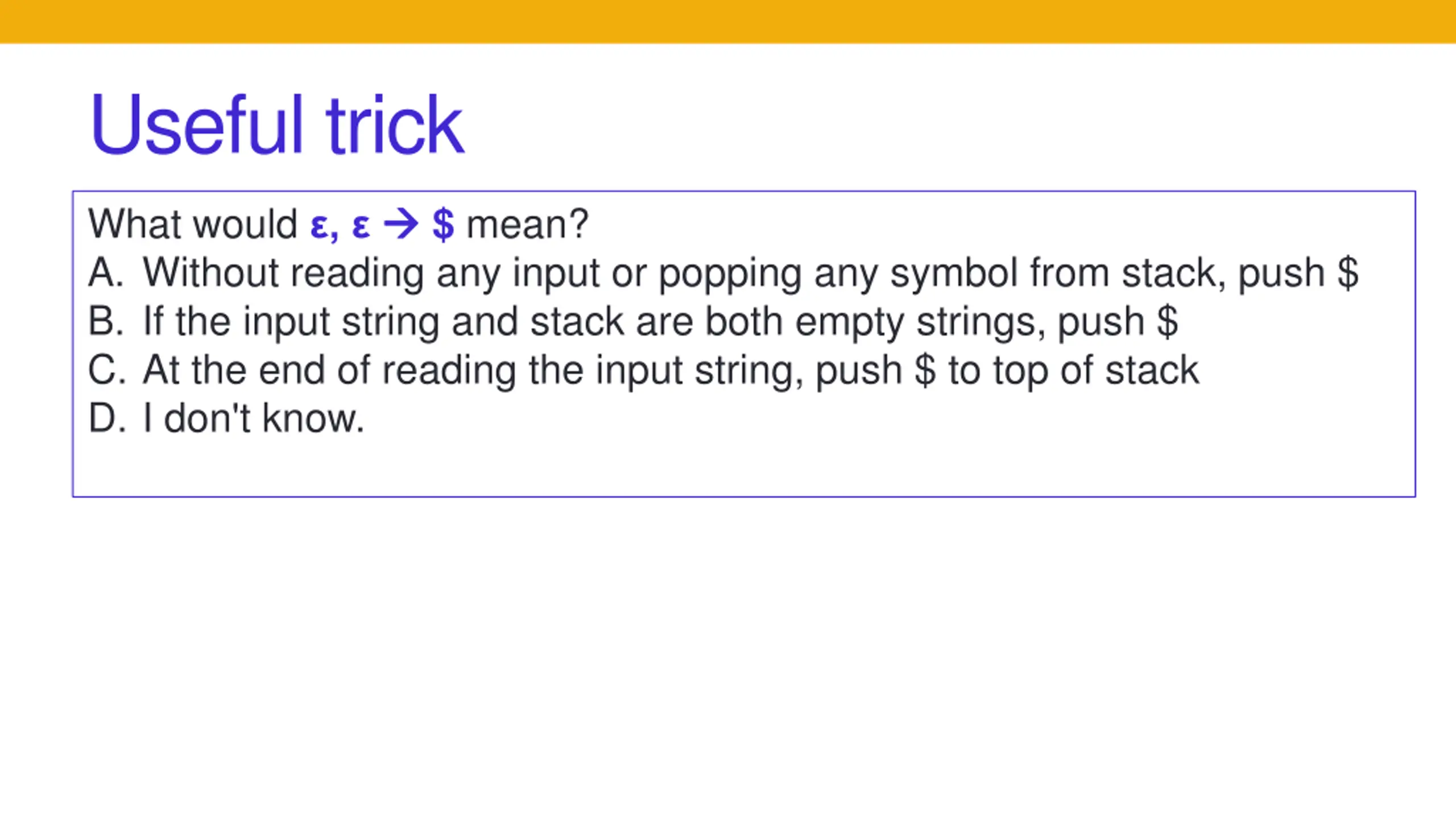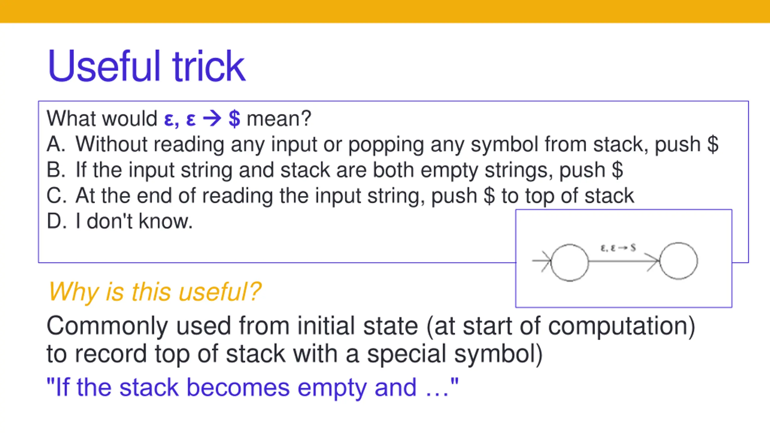 Useful trick What would , A. Without reading any input or popping any symbol from stack, push $ B. If the input string and stack are both empty strings, push $ C. At the end of reading the input string, push $ to top of stack D. I don't know. $ mean? Why is this useful? Commonly used from initial state (at start of computation) to record top of stack with a special symbol) "If the stack becomes empty and "