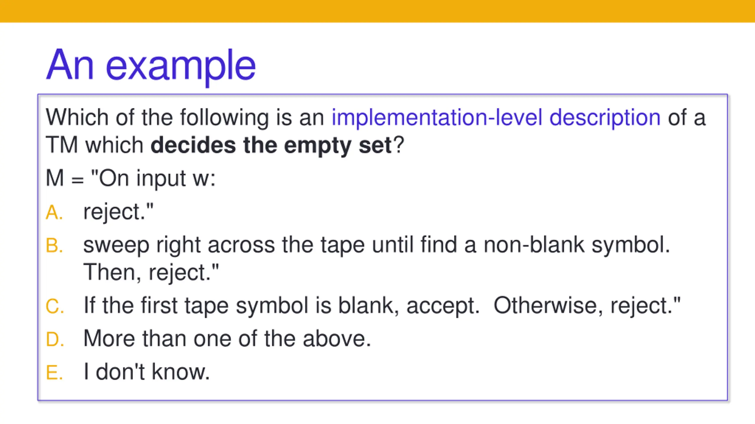 An example Which of the following is an implementation-level description of a TM which decides the empty set? M = "On input w: A. reject." B. sweep right across the tape until find a non-blank symbol. Then, reject." C. If the first tape symbol is blank, accept. Otherwise, reject." D. More than one of the above. E. I don't know.
