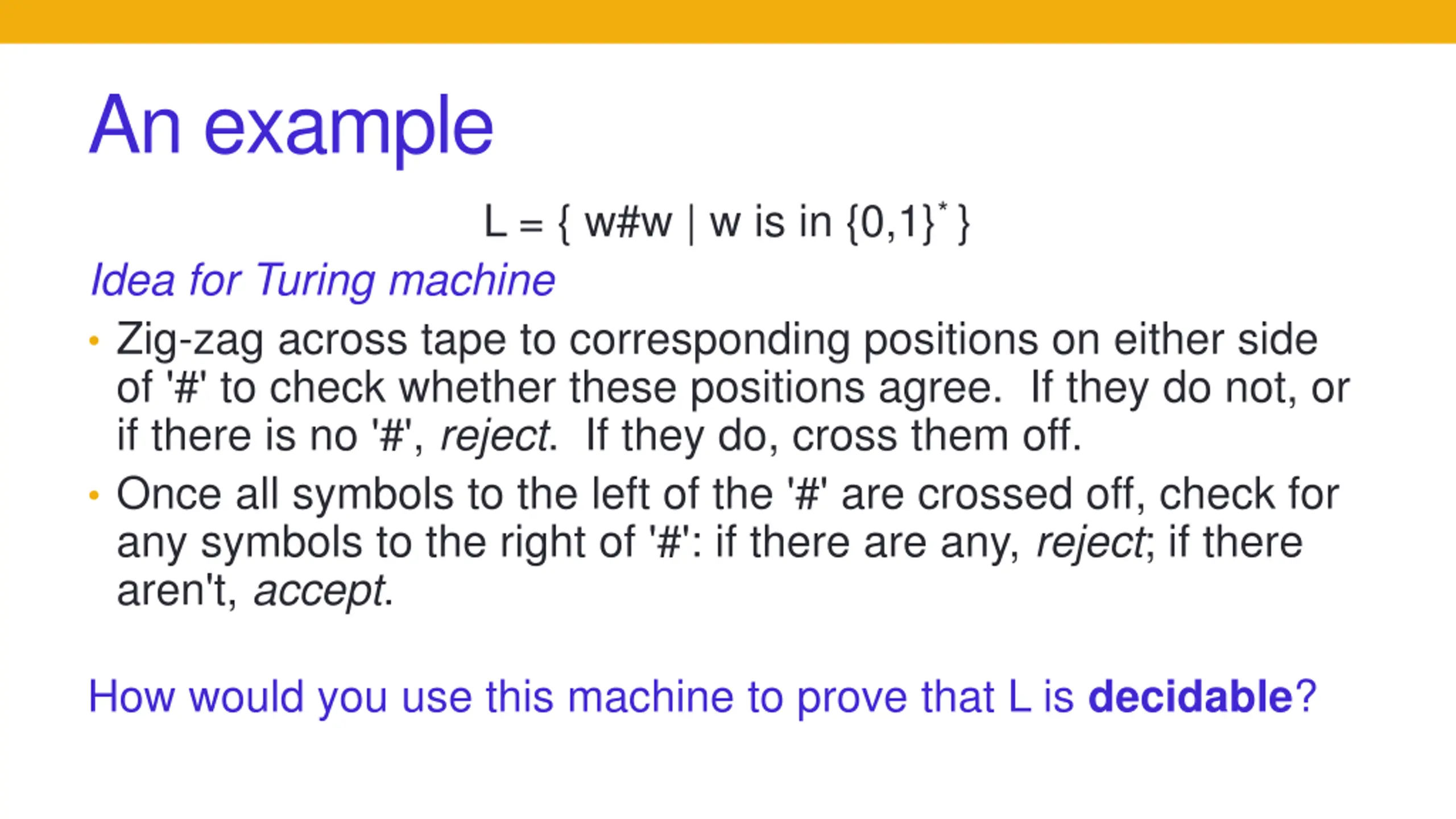 An example L = { w#w | w is in {0,1}* } Idea for Turing machine Zig-zag across tape to corresponding positions on either side of '#' to check whether these positions agree. If they do not, or if there is no '#', reject. If they do, cross them off. Once all symbols to the left of the '#' are crossed off, check for any symbols to the right of '#': if there are any, reject; if there aren't, accept. How would you use this machine to prove that L is decidable?