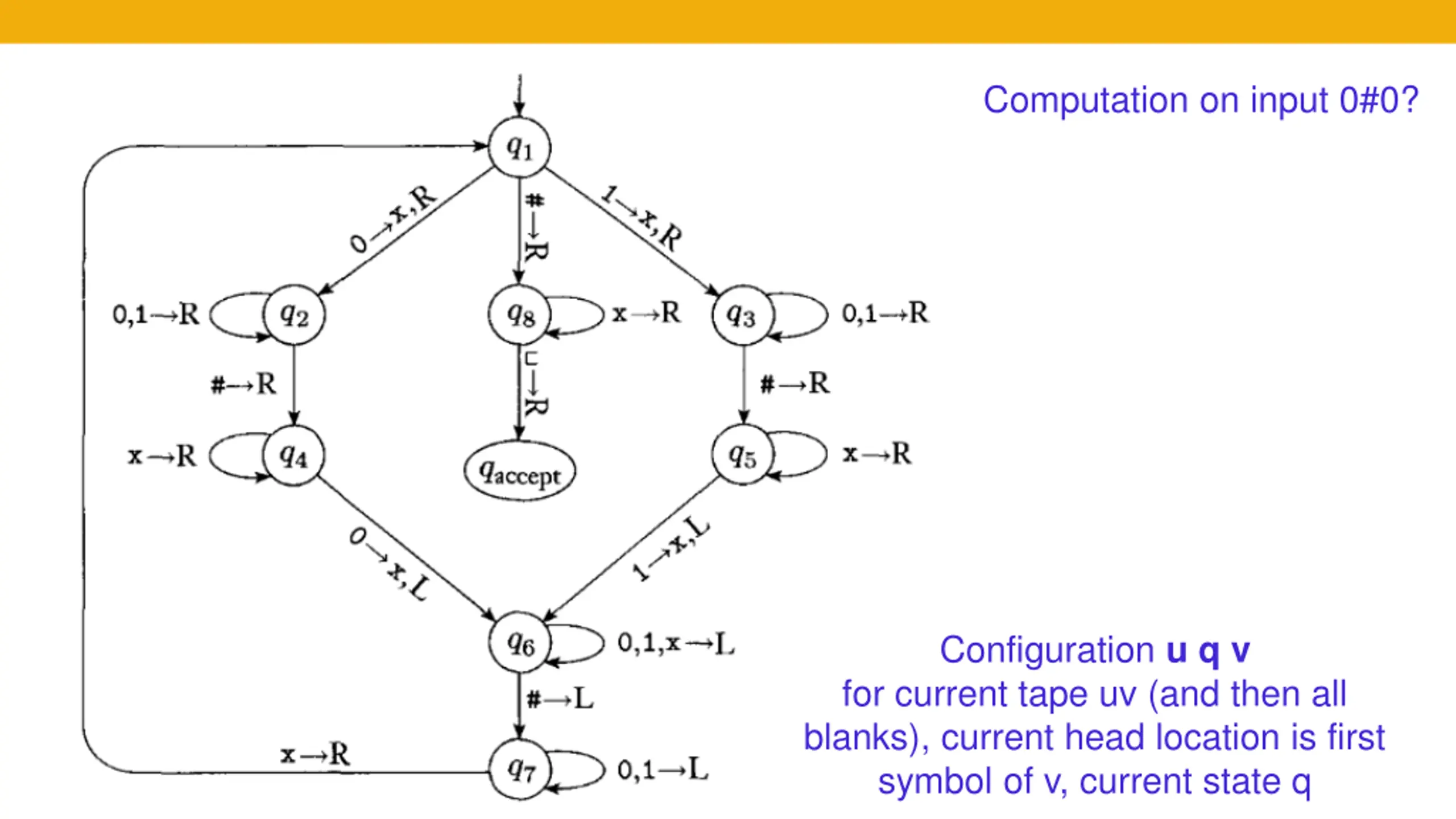 Computation on input 0#0? Configuration u q v for current tape uv (and then all blanks), current head location is first symbol of v, current state q