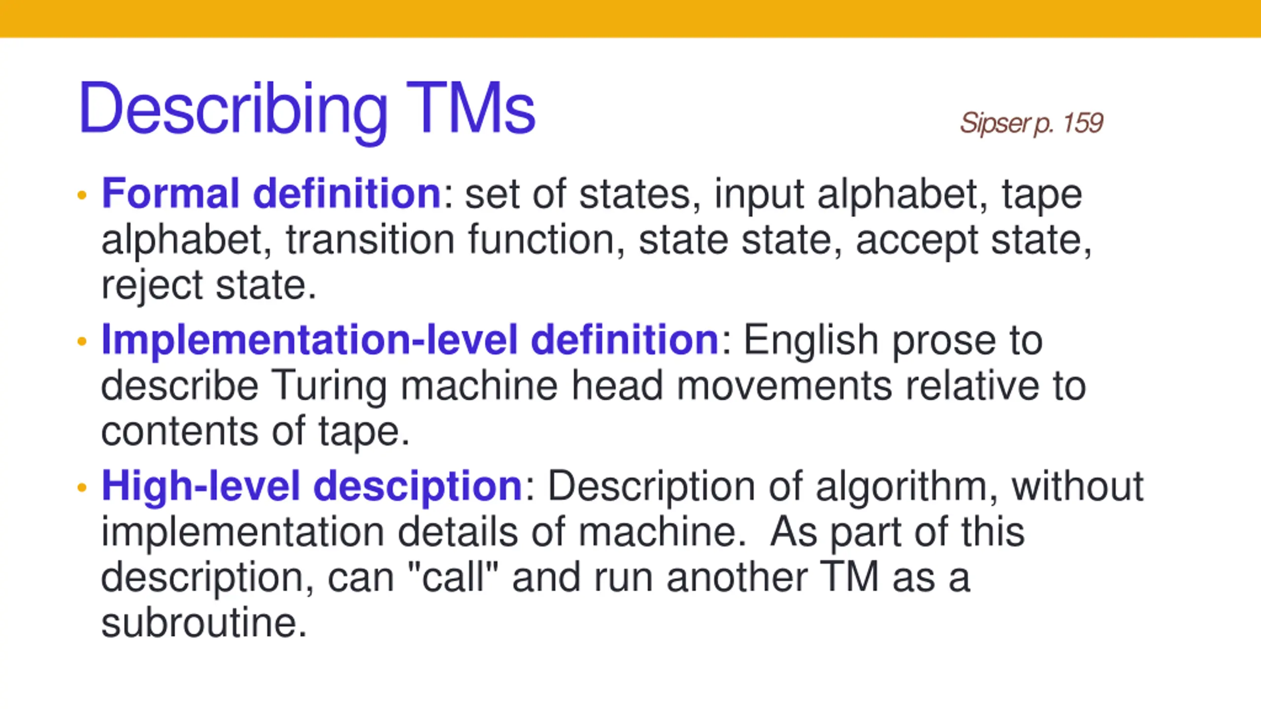 Describing TMs Sipser p. 159 Formal definition: set of states, input alphabet, tape alphabet, transition function, state state, accept state, reject state. Implementation-level definition: English prose to describe Turing machine head movements relative to contents of tape. High-level desciption: Description of algorithm, without implementation details of machine. As part of this description, can "call" and run another TM as a subroutine.