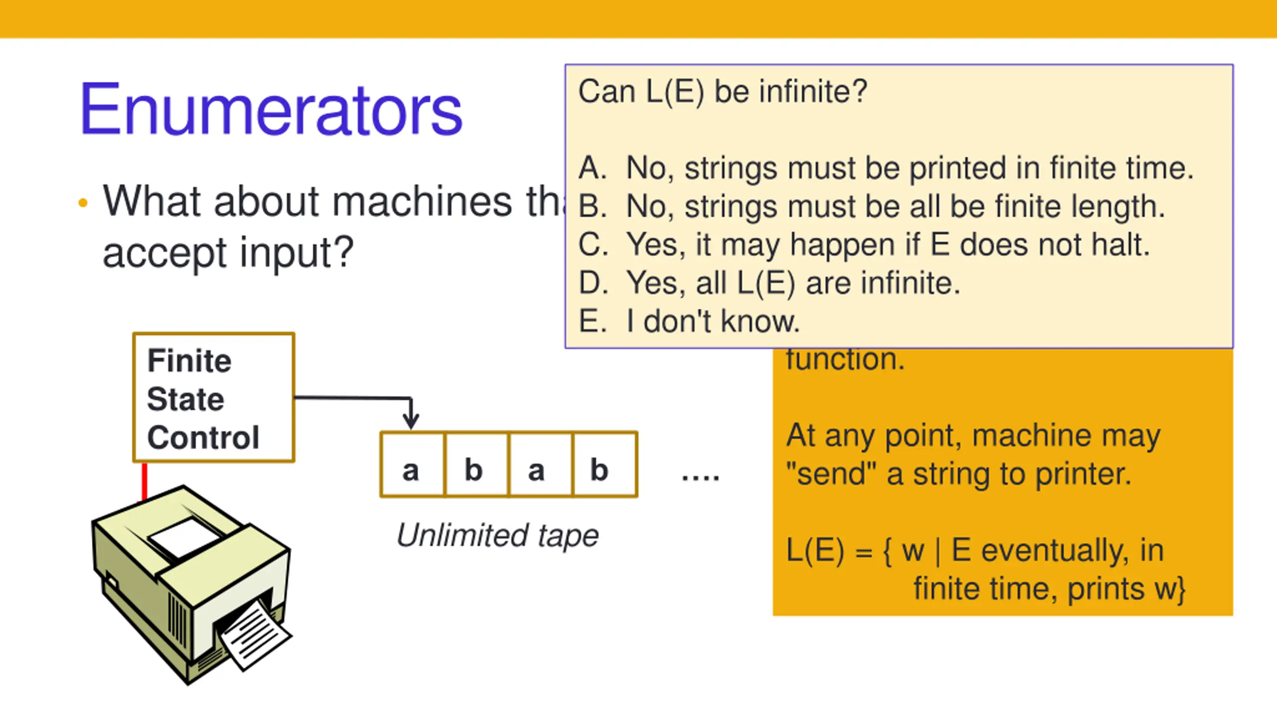 Enumerators Can L(E) be infinite? A. No, strings must be printed in finite time. B. No, strings must be all be finite length. C. Yes, it may happen if E does not halt. What about machines that produce output rather than accept input? D. Yes, all L(E) are infinite. E. I don't know. Computation proceeds according to transition function. Finite State Control At any point, machine may "send" a string to printer. a b a b . Unlimited tape L(E) = { w | E eventually, in finite time, prints w}