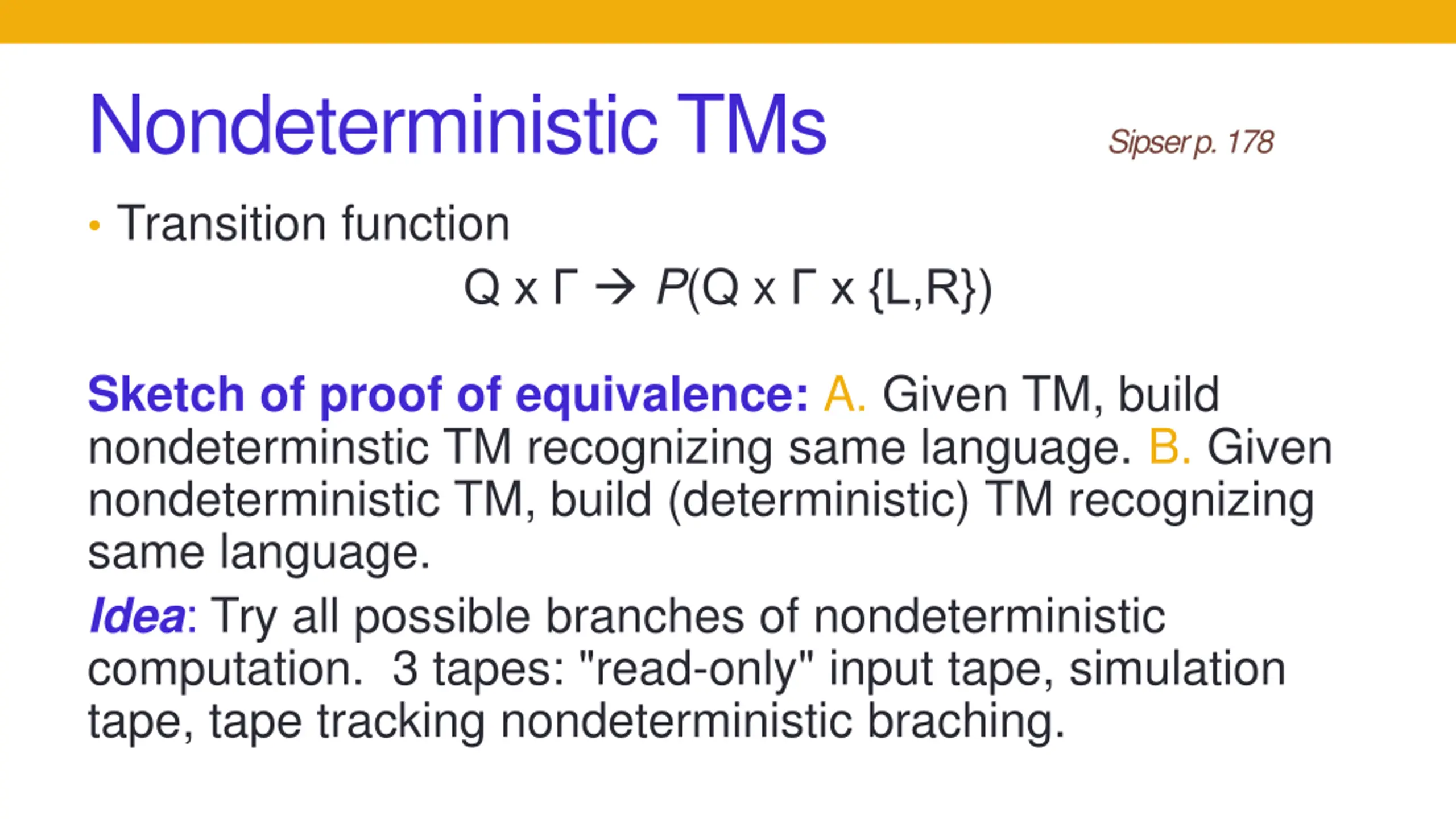 Nondeterministic TMs Sipser p. 178 Transition function Q x P(Q x x {L,R}) Sketch of proof of equivalence: A. Given TM, build nondeterminstic TM recognizing same language. B. Given nondeterministic TM, build (deterministic) TM recognizing same language. Idea: Try all possible branches of nondeterministic computation. 3 tapes: "read-only" input tape, simulation tape, tape tracking nondeterministic braching.
