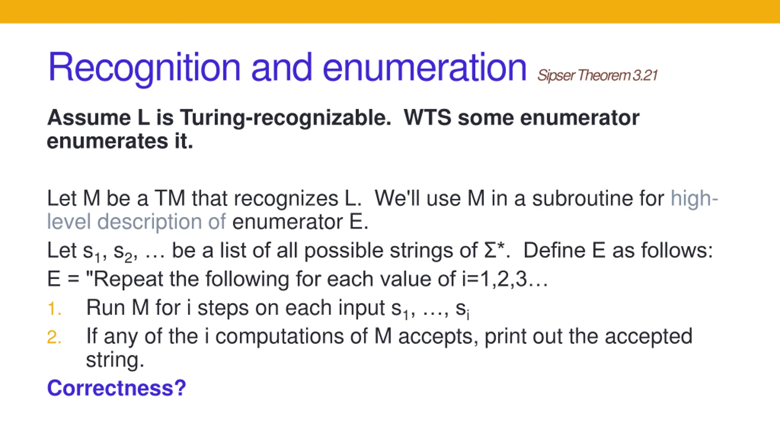 Recognition and enumeration Sipser Theorem 3.21 Assume L is Turing-recognizable. WTS some enumerator enumerates it. Let M be a TM that recognizes L. We'll use M in a subroutine for high- level description of enumerator E. Let s1, s2, be a list of all possible strings of *. Define E as follows: E = "Repeat the following for each value of i=1,2,3 1. Run M for i steps on each input s1, , si 2. If any of the i computations of M accepts, print out the accepted string. Correctness?