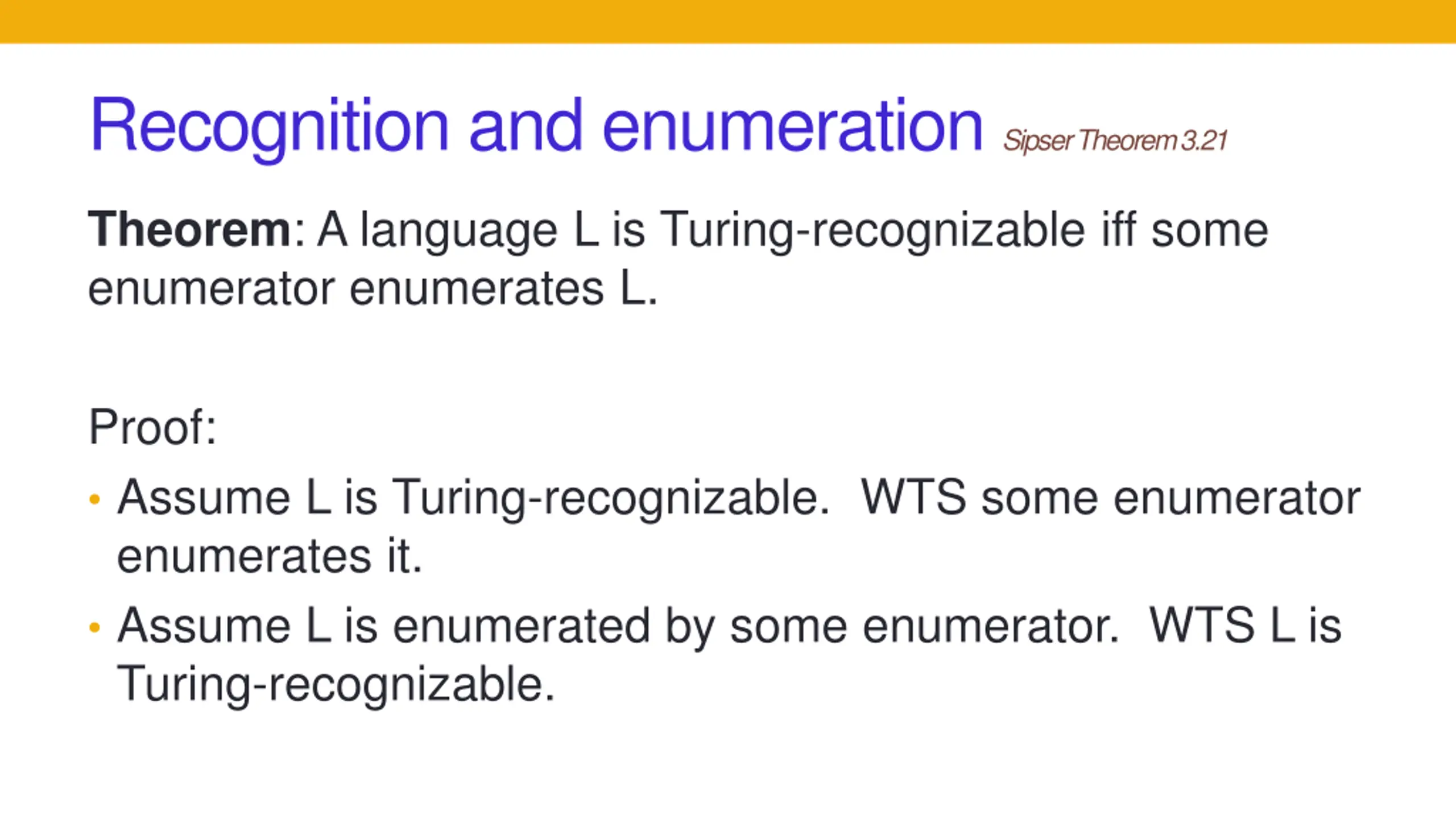 Recognition and enumeration Sipser Theorem 3.21 Theorem: A language L is Turing-recognizable iff some enumerator enumerates L. Proof: Assume L is Turing-recognizable. WTS some enumerator enumerates it. Assume L is enumerated by some enumerator. WTS L is Turing-recognizable.