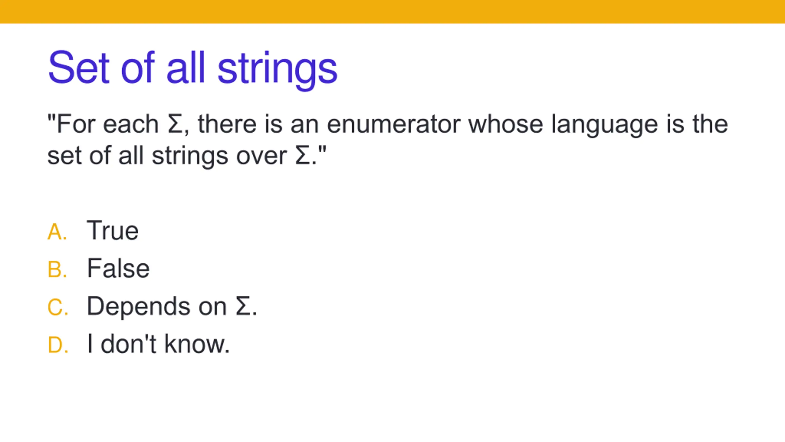 Set of all strings "For each , there is an enumerator whose language is the set of all strings over ." A. True B. False C. Depends on . D. I don't know.
