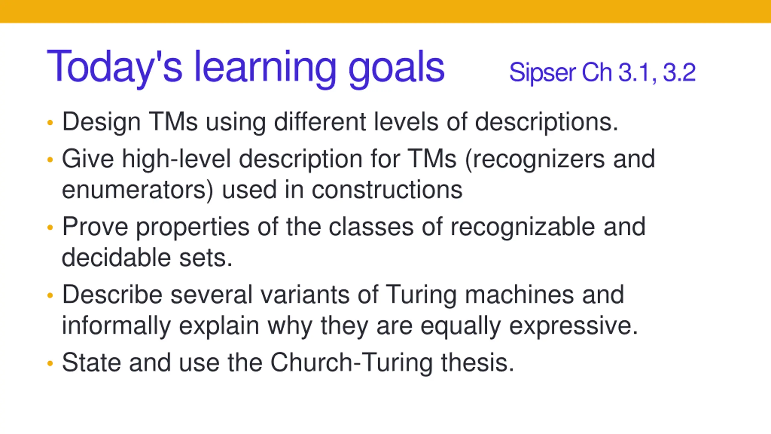 Today's learning goals SipserCh 3.1, 3.2 Design TMs using different levels of descriptions. Give high-level description for TMs (recognizers and enumerators) used in constructions Prove properties of the classes of recognizable and decidable sets. Describe several variants of Turing machines and informally explain why they are equally expressive. State and use the Church-Turing thesis.
