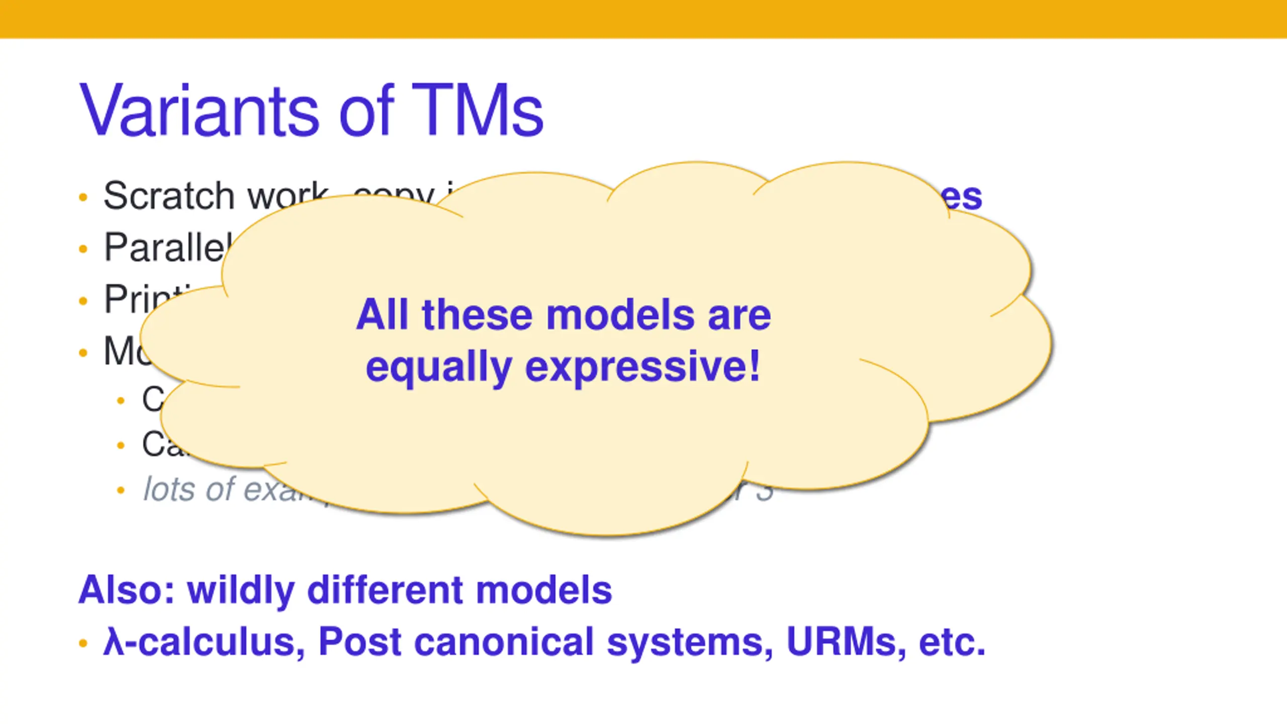Variants of TMs Scratch work, copy input, Parallel computation Printing vs. accepting More flexible transition function Can "stay put" Can "get stuck" lots of examples in exercises to Chapter 3 Multiple tapes Nondeterminism Enumerators All these models are equally expressive! Also: wildly different models -calculus, Post canonical systems, URMs, etc.