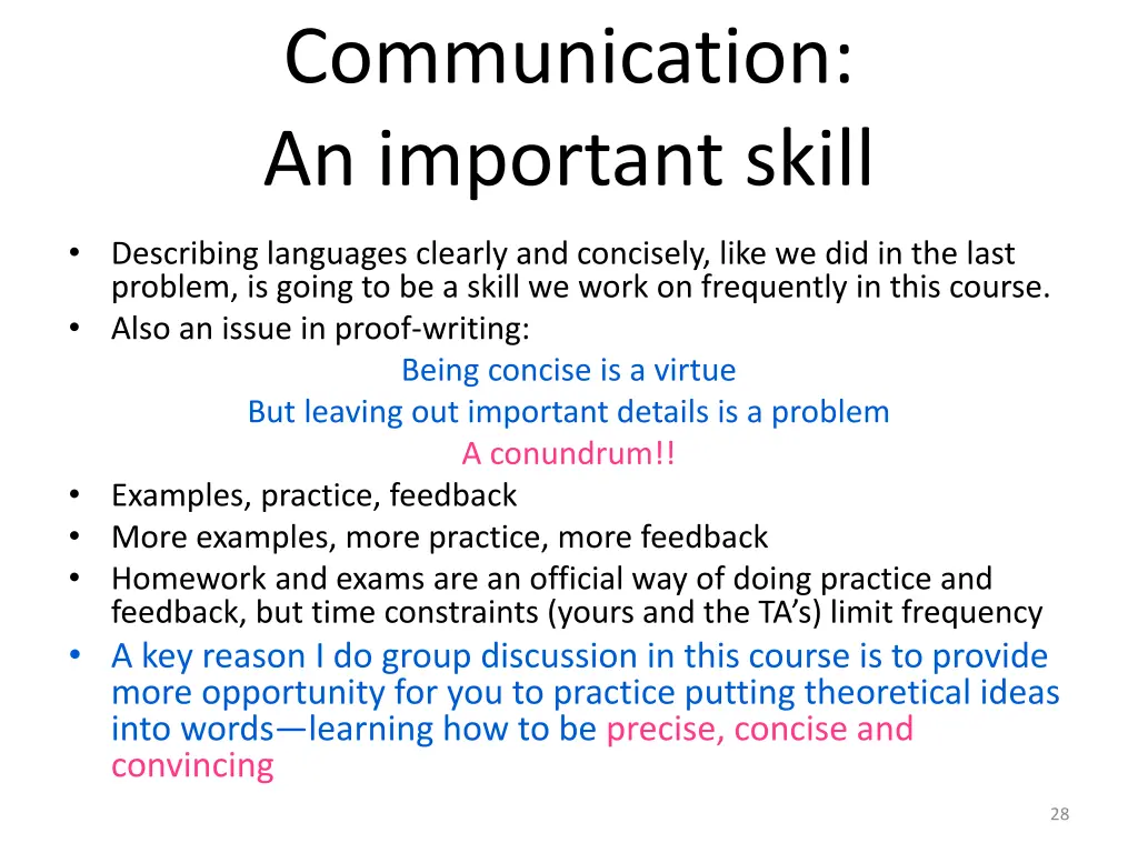 Communication: An important skill Describing languages clearly and concisely, like we did in the last problem, is going to be a skill we work on frequently in this course. Also an issue in proof-writing: Being concise is a virtue But leaving out important details is a problem A conundrum!! Examples, practice, feedback More examples, more practice, more feedback Homework and exams are an official way of doing practice and feedback, but time constraints (yours and the TA s) limit frequency A key reason I do group discussion in this course is to provide more opportunity for you to practice putting theoretical ideas into words learning how to be precise, concise and convincing 28