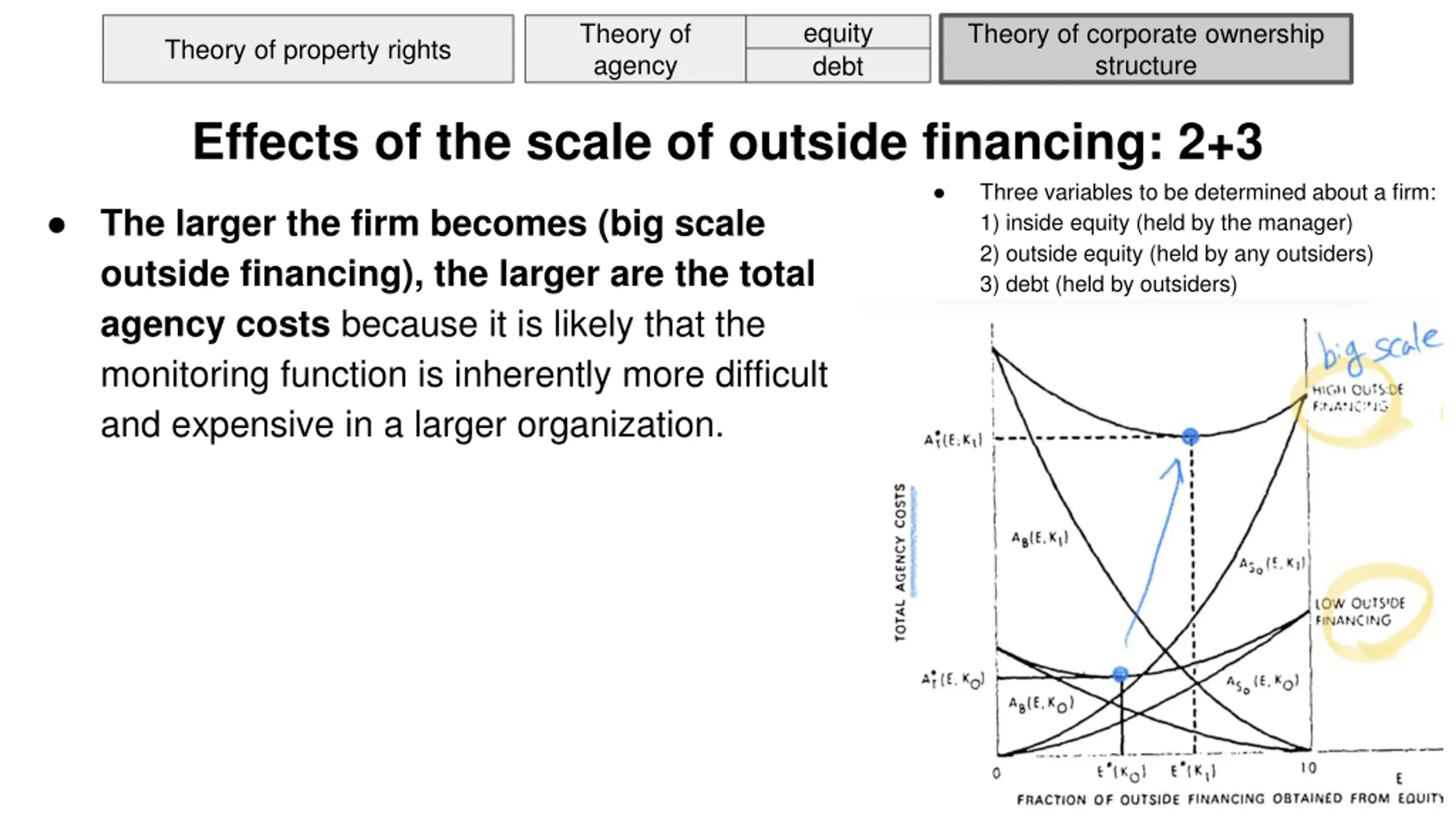 equity debt Theory of agency Theory of corporate ownership structure Theory of property rights Effects of the scale of outside financing: 2+3 Three variables to be determined about a firm: 1) inside equity (held by the manager) 2) outside equity (held by any outsiders) 3) debt (held by outsiders) The larger the firm becomes (big scale outside financing), the larger are the total agency costs because it is likely that the monitoring function is inherently more difficult and expensive in a larger organization.