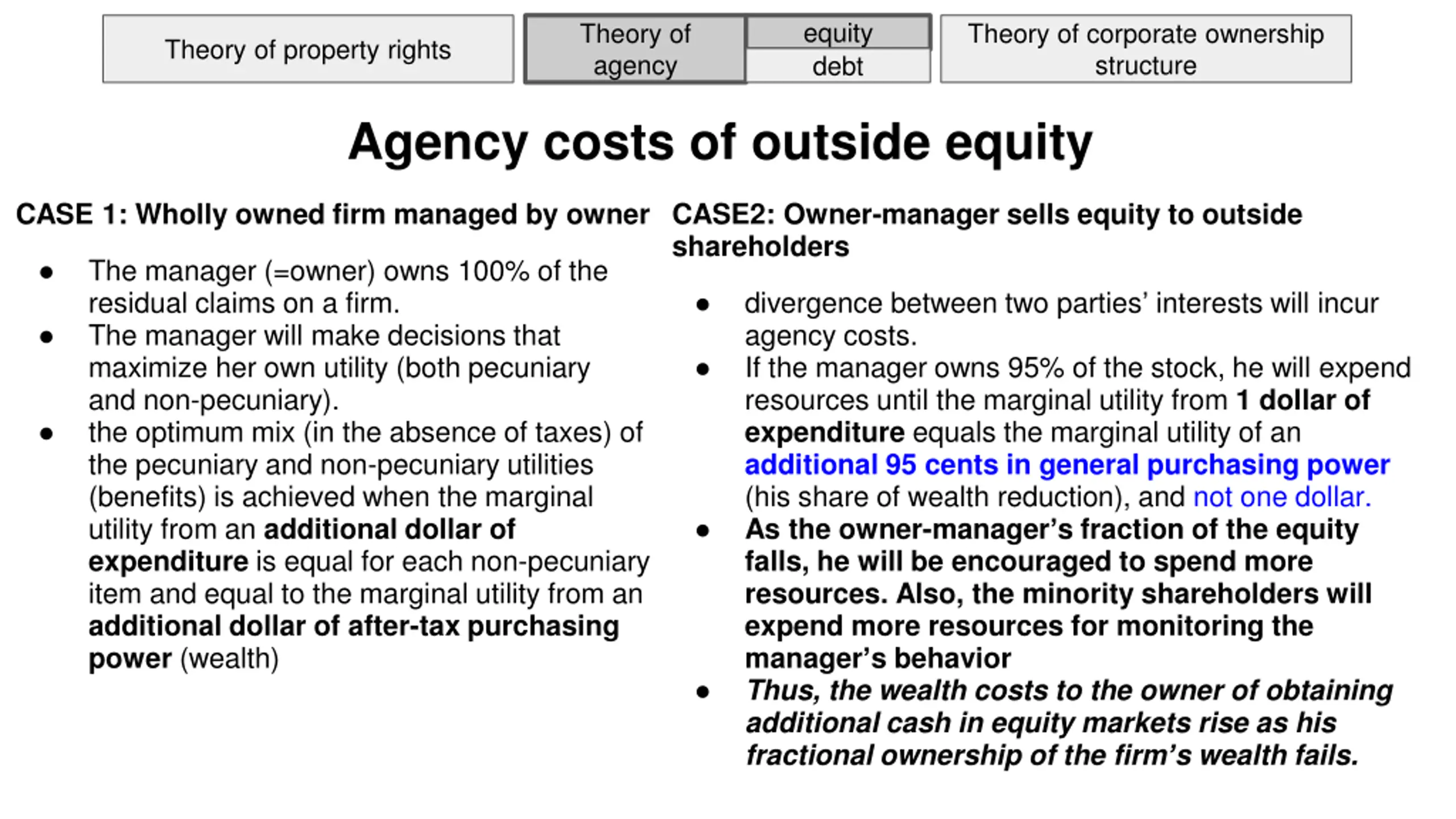 equity debt Theory of agency Theory of corporate ownership structure Theory of property rights Bottom line Agency cost is non-zero (there are costs related to the separation of ownership and control) Agency relationship is non-optimal The first-best world is not obtainable A manager in a firm will choose a (second-best) set of activities for the firm so that the total value of the firm is LESS than it would be if he/she were the sole owner. This outcome is independent of whether the firm operates in monopolistic or competitive product markets.