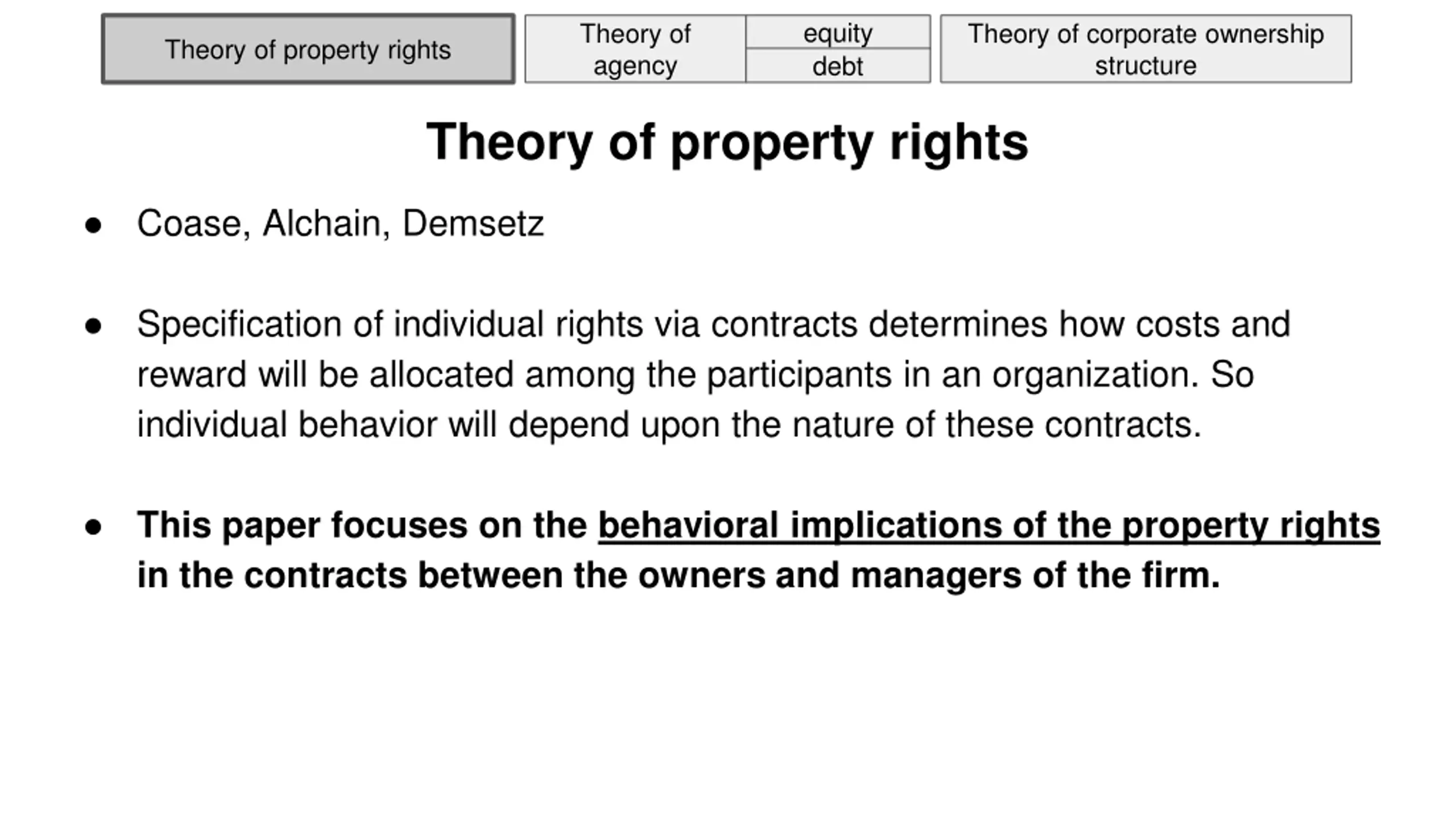 equity debt Theory of agency Theory of corporate ownership structure Theory of property rights Theory of property rights Coase, Alchain, Demsetz Specification of individual rights via contracts determines how costs and reward will be allocated among the participants in an organization. So individual behavior will depend upon the nature of these contracts. This paper focuses on the behavioral implications of the property rights in the contracts between the owners and managers of the firm.