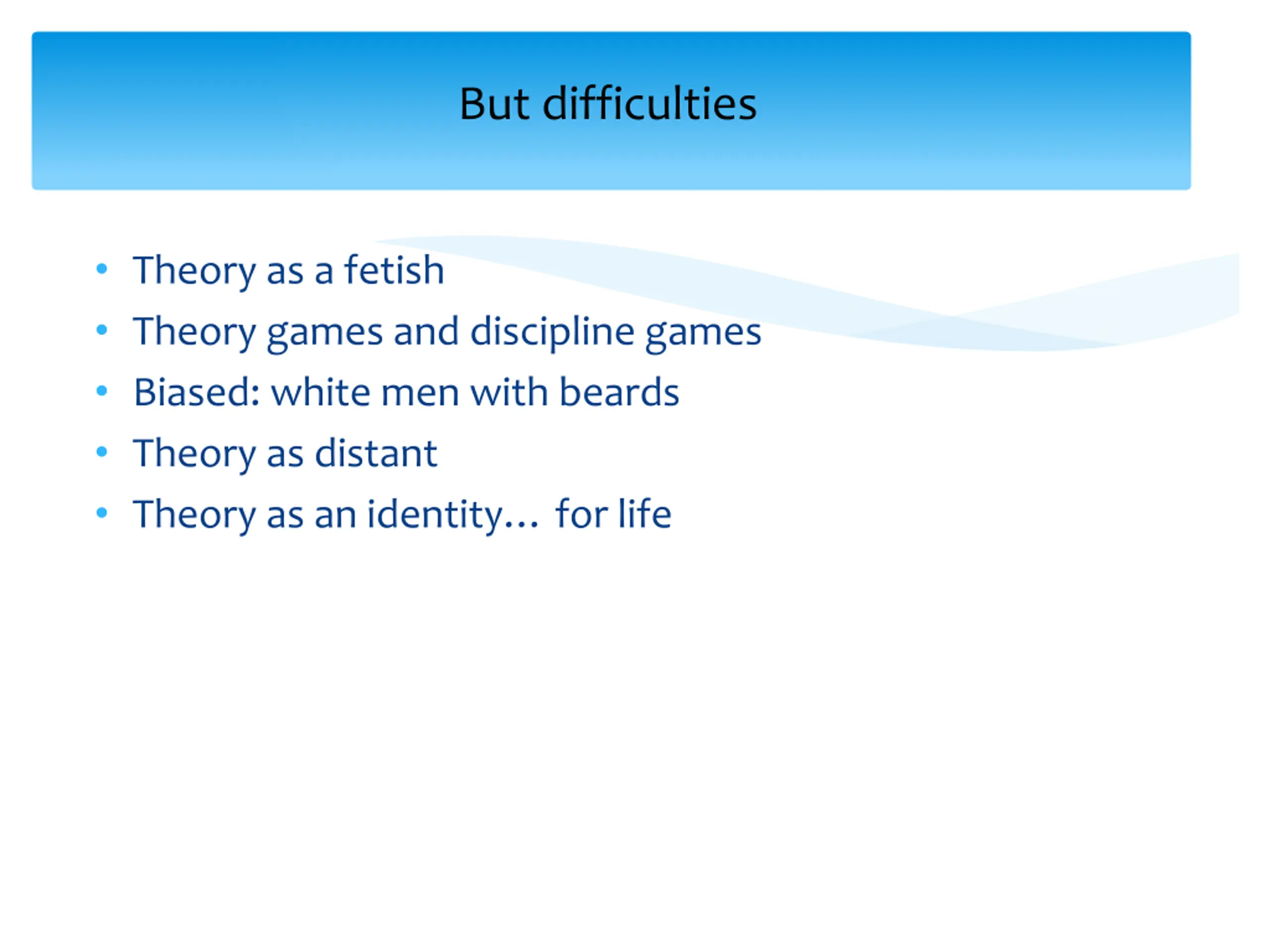 But difficulties Theory as a fetish Theory games and discipline games Biased: white men with beards Theory as distant Theory as an identity for life