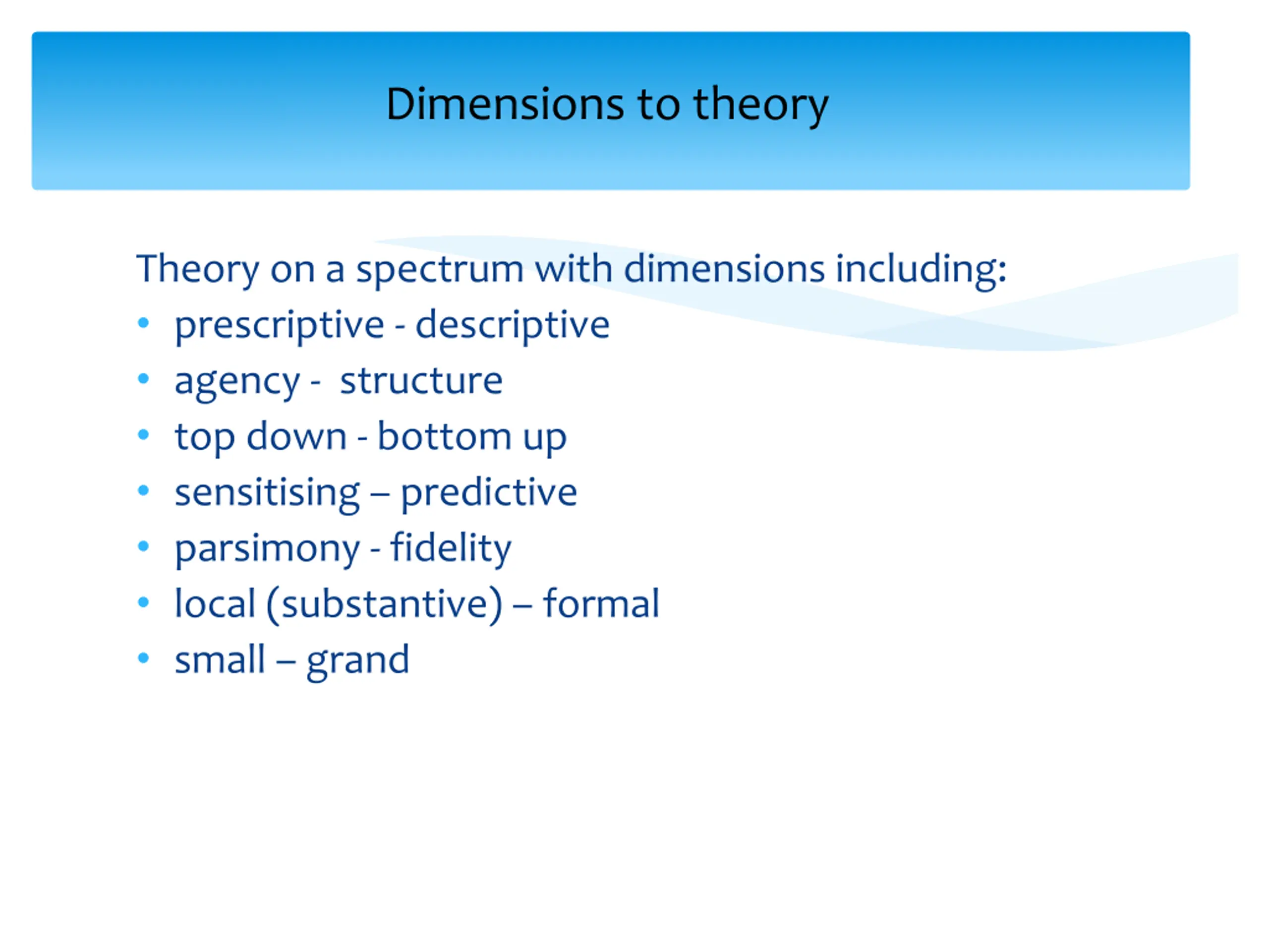 Dimensions to theory Theory on a spectrum with dimensions including: prescriptive - descriptive agency - structure top down - bottom up sensitising predictive parsimony - fidelity local (substantive) formal small grand