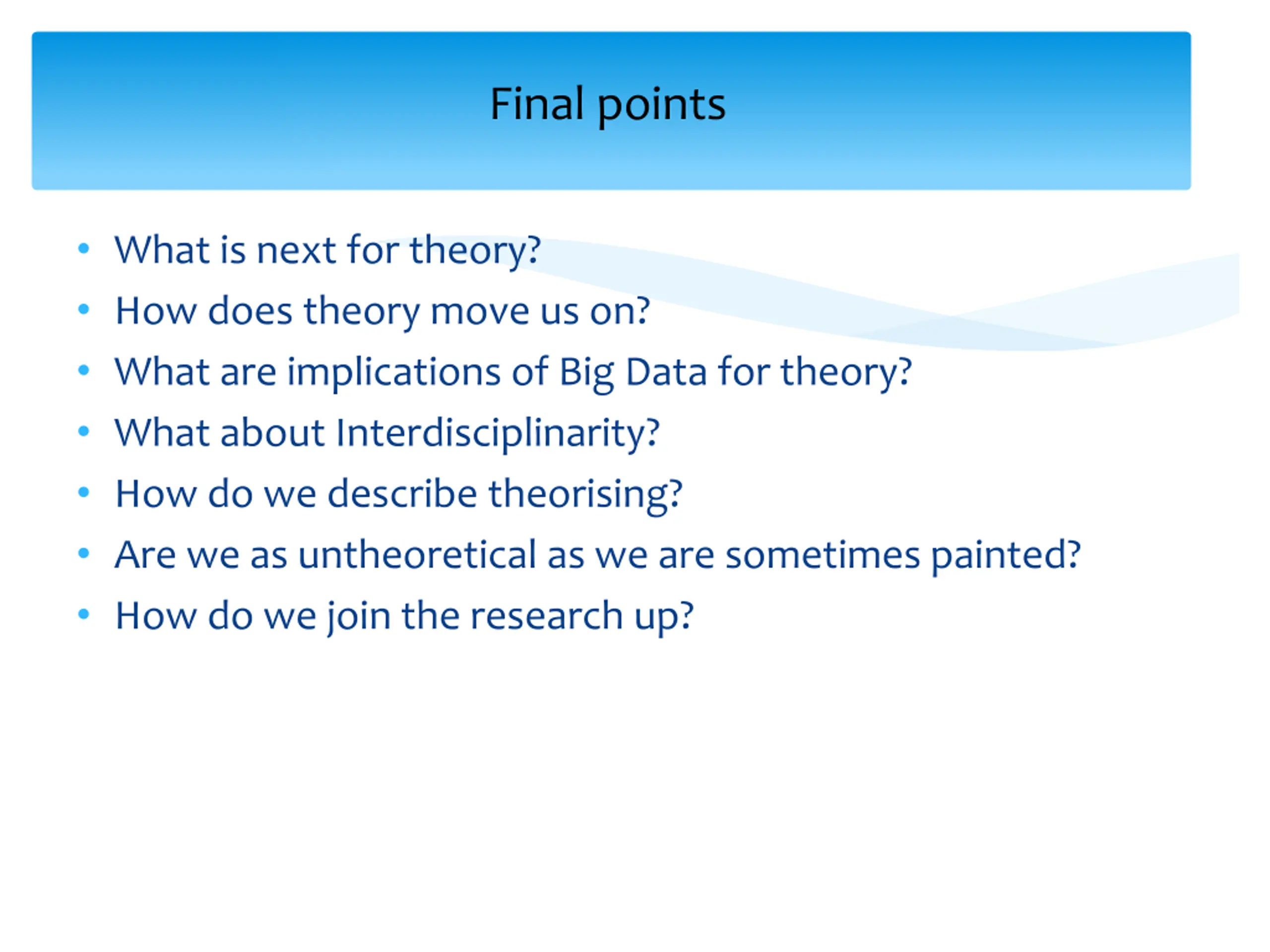 Final points What is next for theory? How does theory move us on? What are implications of Big Data for theory? What about Interdisciplinarity? How do we describe theorising? Are we as untheoretical as we are sometimes painted? How do we join the research up?