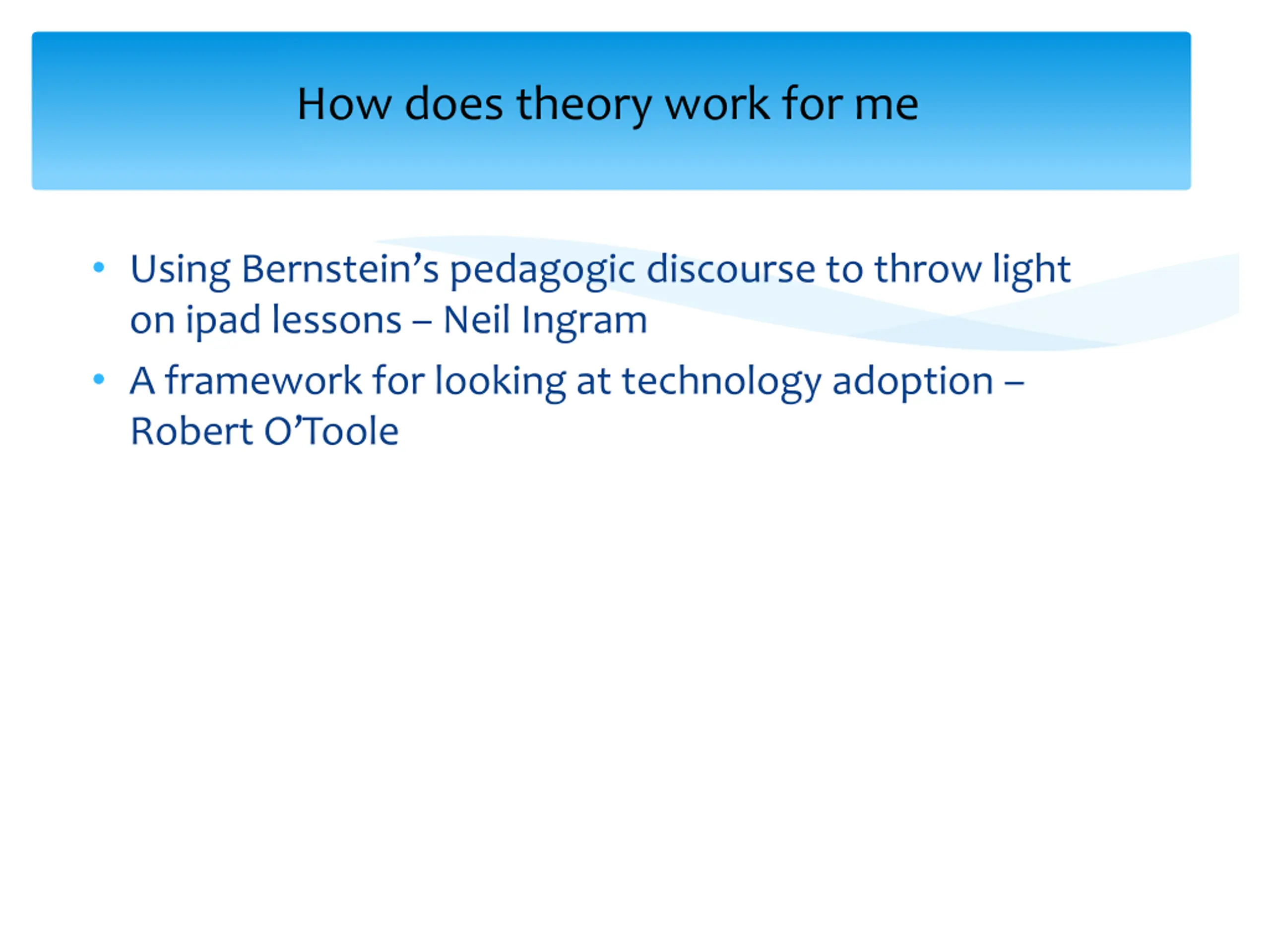 How does theory work for me Using Bernstein s pedagogic discourse to throw light on ipad lessons Neil Ingram A framework for looking at technology adoption Robert O Toole