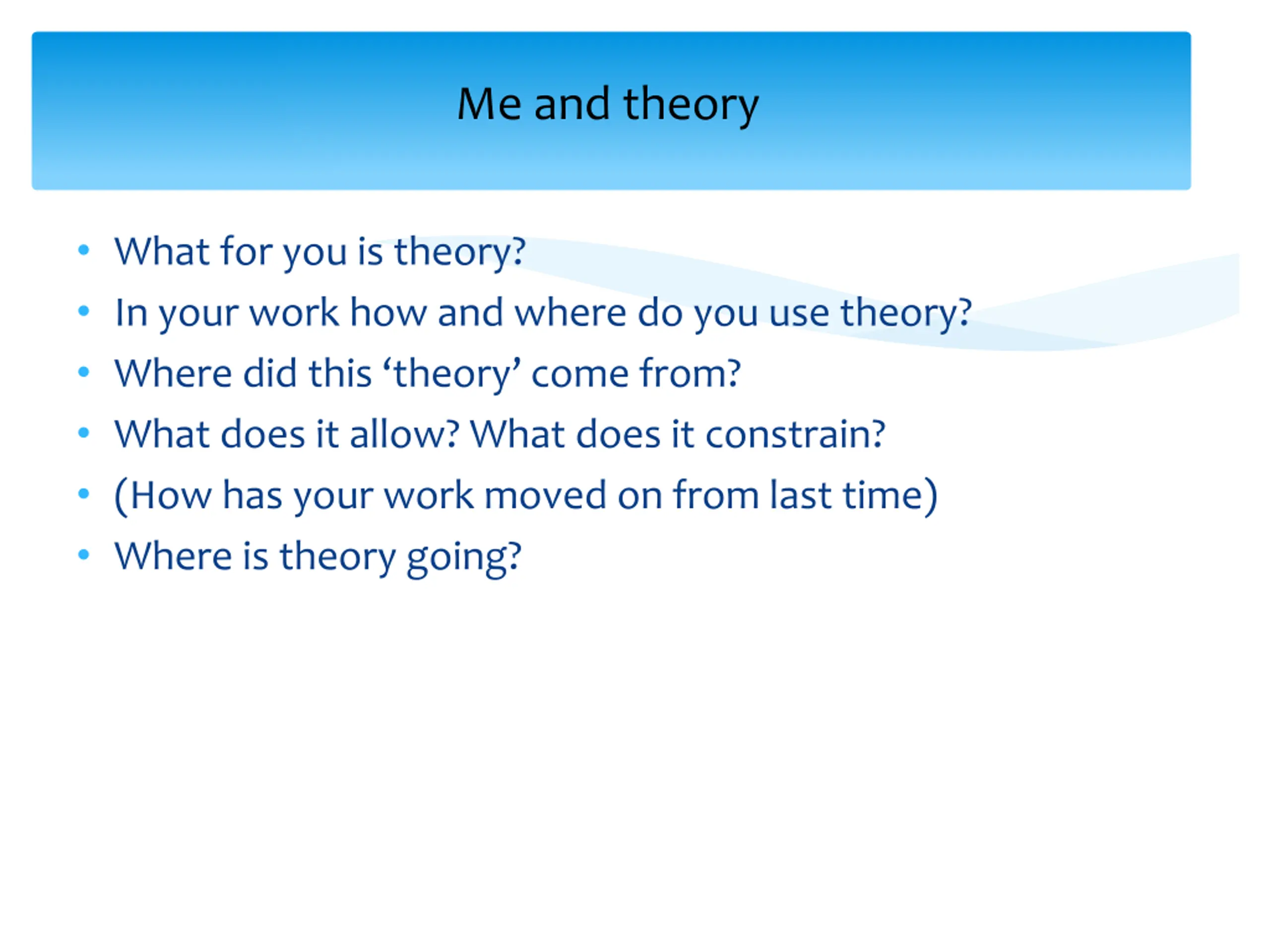 Me and theory What for you is theory? In your work how and where do you use theory? Where did this theory come from? What does it allow? What does it constrain? (How has your work moved on from last time) Where is theory going?