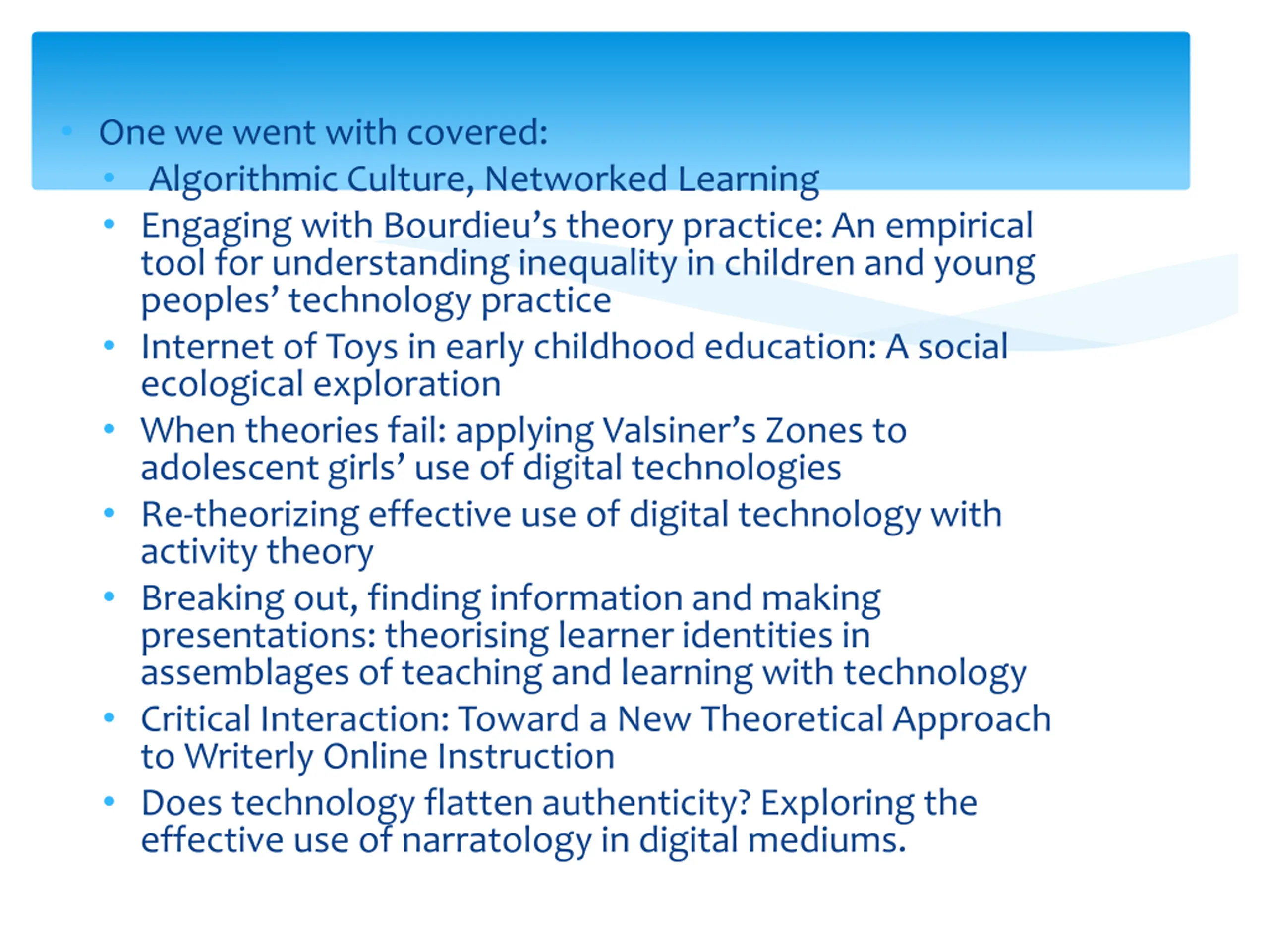 One we went with covered: Algorithmic Culture, Networked Learning Engaging with Bourdieu s theory practice: An empirical tool for understanding inequality in children and young peoples technology practice Internet of Toys in early childhood education: A social ecological exploration When theories fail: applying Valsiner s Zones to adolescent girls use of digital technologies Re-theorizing effective use of digital technology with activity theory Breaking out, finding information and making presentations: theorising learner identities in assemblages of teaching and learning with technology Critical Interaction: Toward a New Theoretical Approach to Writerly Online Instruction Does technology flatten authenticity? Exploring the effective use of narratology in digital mediums.