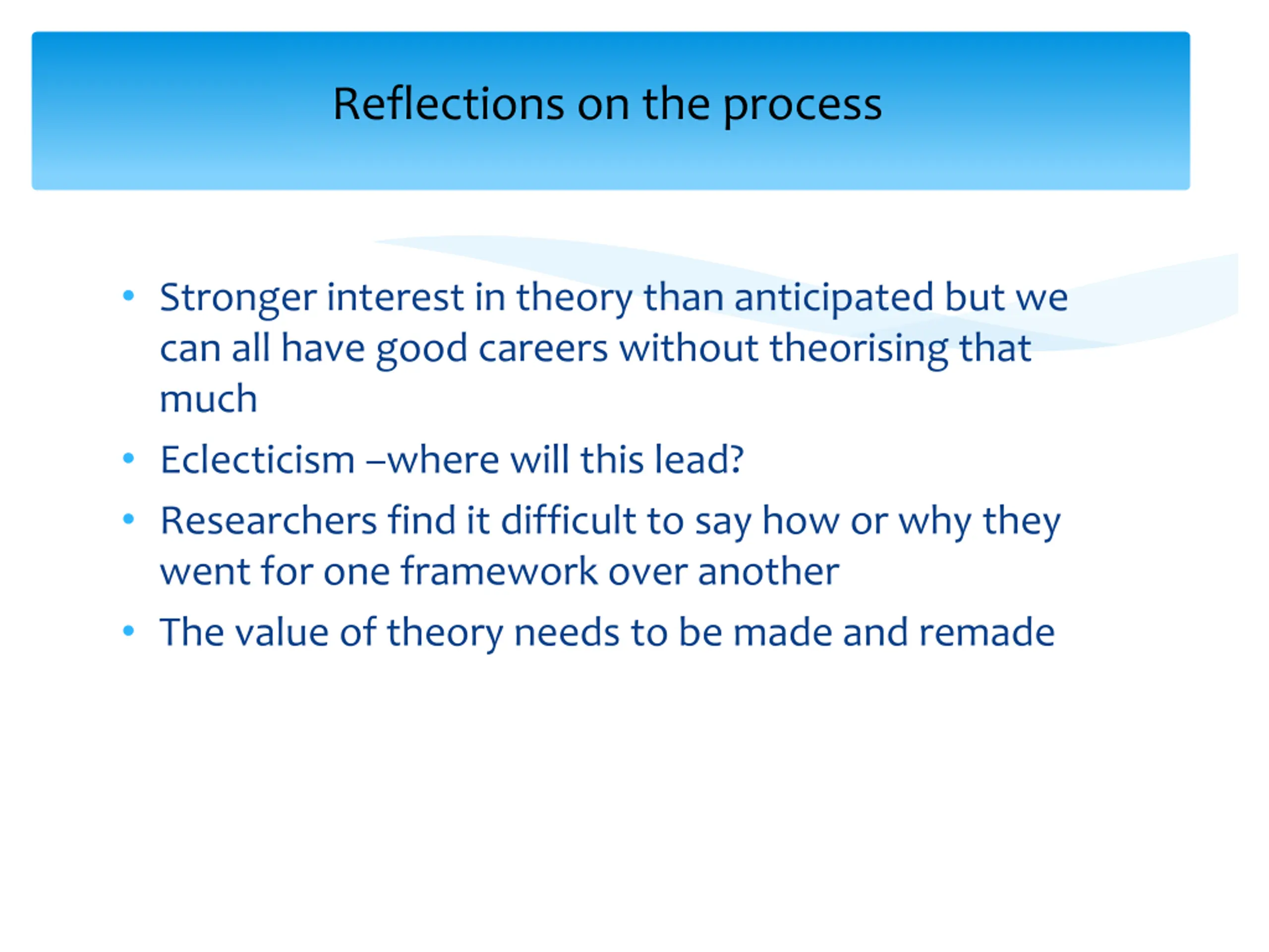 Reflections on the process Stronger interest in theory than anticipated but we can all have good careers without theorising that much Eclecticism where will this lead? Researchers find it difficult to say how or why they went for one framework over another The value of theory needs to be made and remade
