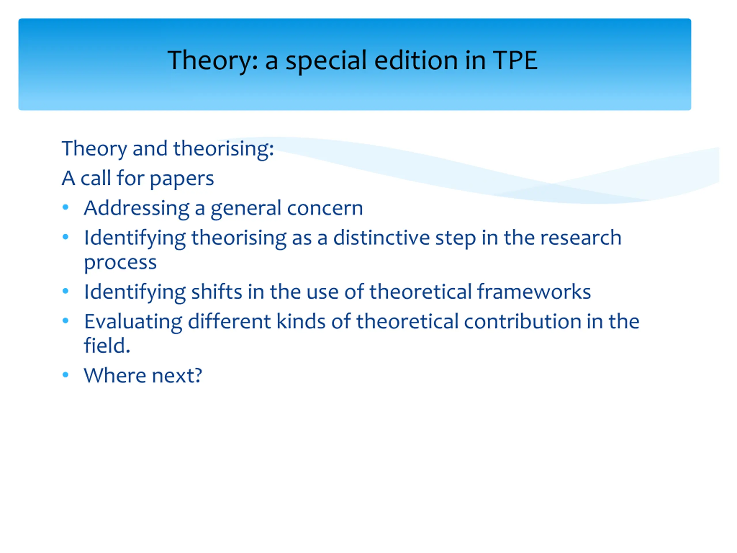 Theory: a special edition in TPE Theory and theorising: A call for papers Addressing a general concern Identifying theorising as a distinctive step in the research process Identifying shifts in the use of theoretical frameworks Evaluating different kinds of theoretical contribution in the field. Where next?