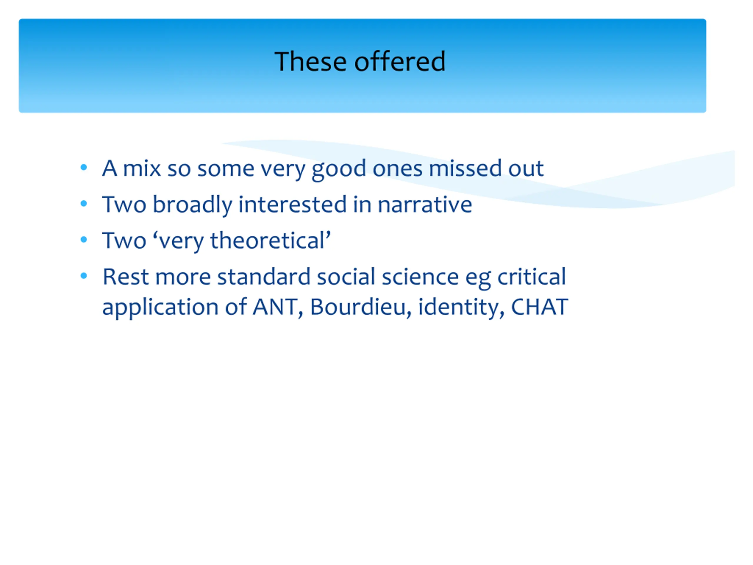 These offered A mix so some very good ones missed out Two broadly interested in narrative Two very theoretical Rest more standard social science eg critical application of ANT, Bourdieu, identity, CHAT