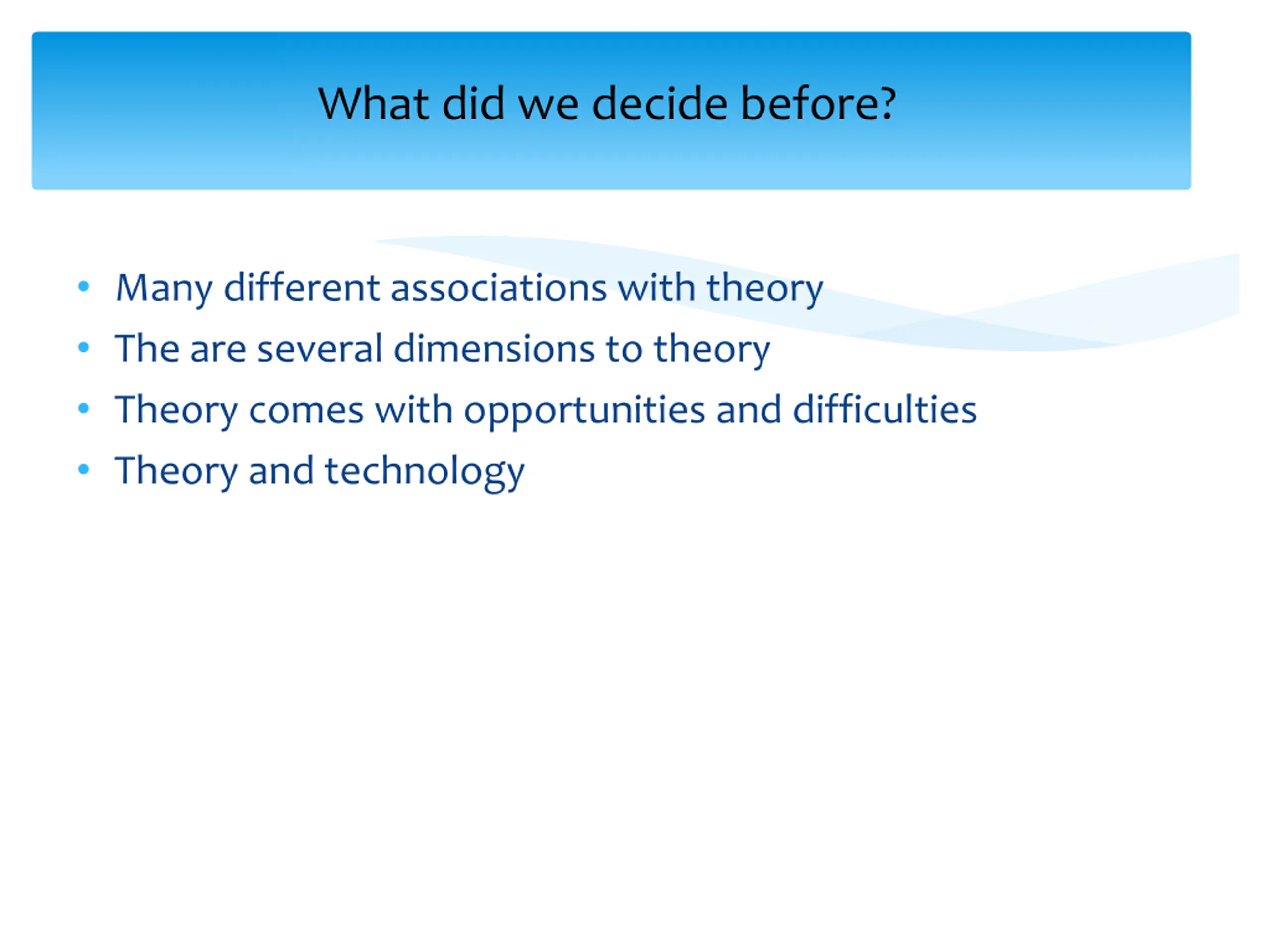 What did we decide before? Many different associations with theory The are several dimensions to theory Theory comes with opportunities and difficulties Theory and technology