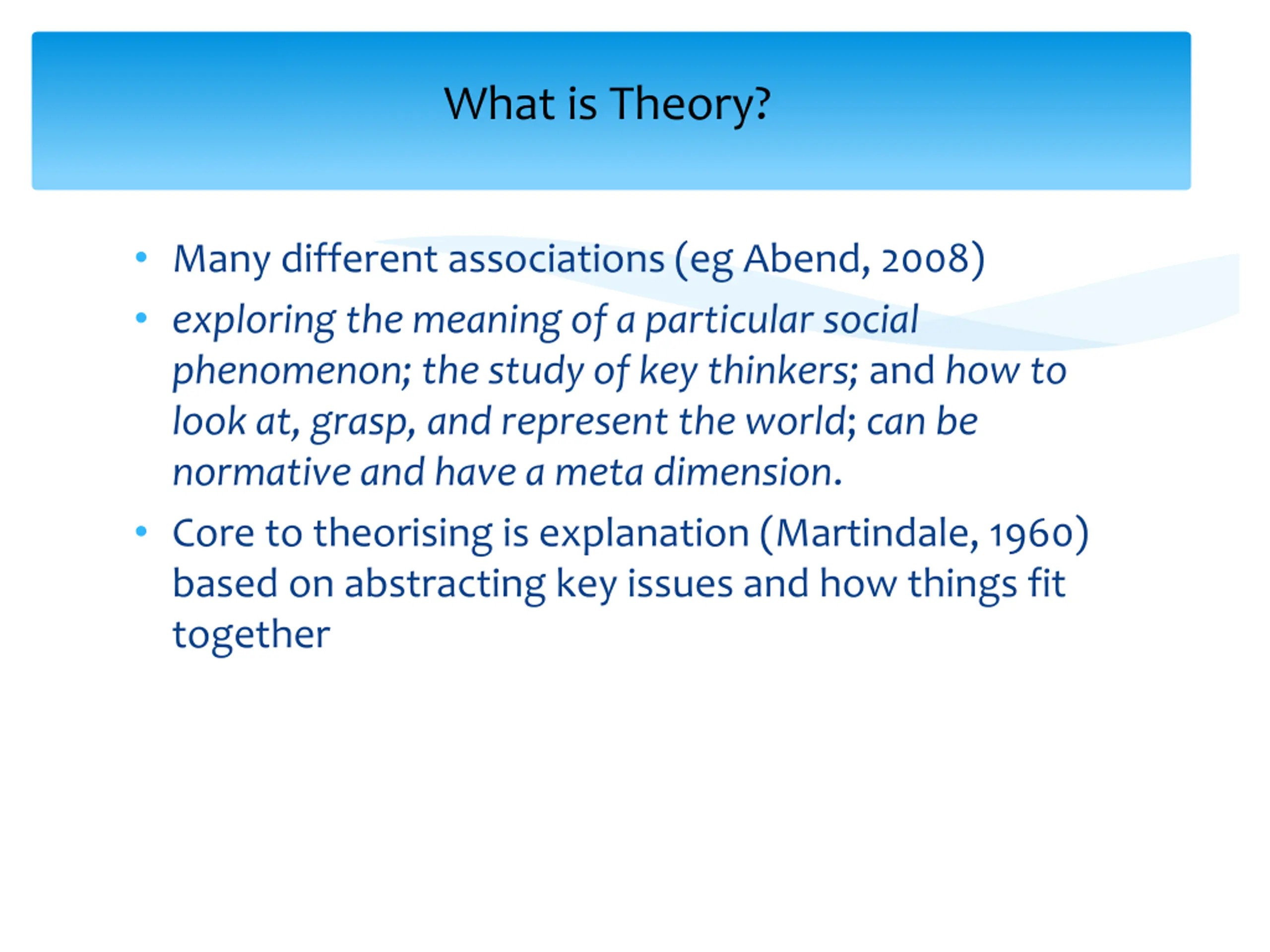What is Theory? Many different associations (eg Abend, 2008) exploring the meaning of a particular social phenomenon; the study of key thinkers; and how to look at, grasp, and represent the world; can be normative and have a meta dimension. Core to theorising is explanation (Martindale, 1960) based on abstracting key issues and how things fit together