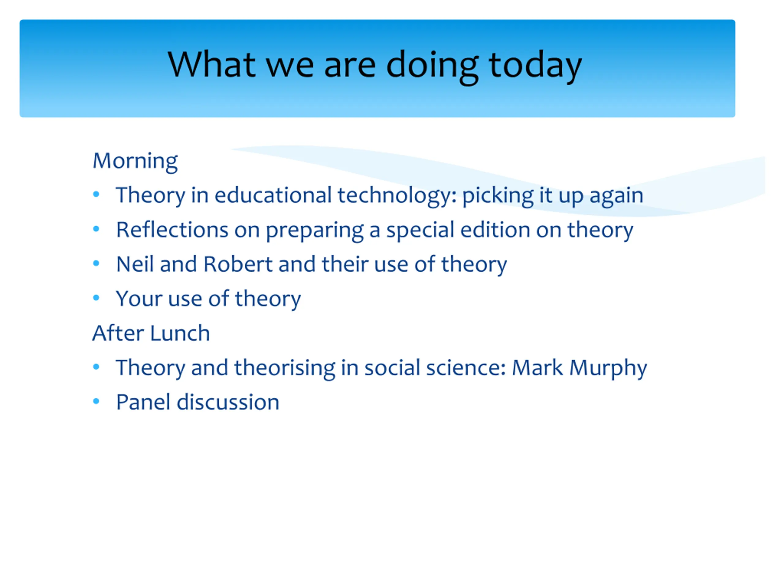 What we are doing today Morning Theory in educational technology: picking it up again Reflections on preparing a special edition on theory Neil and Robert and their use of theory Your use of theory After Lunch Theory and theorising in social science: Mark Murphy Panel discussion