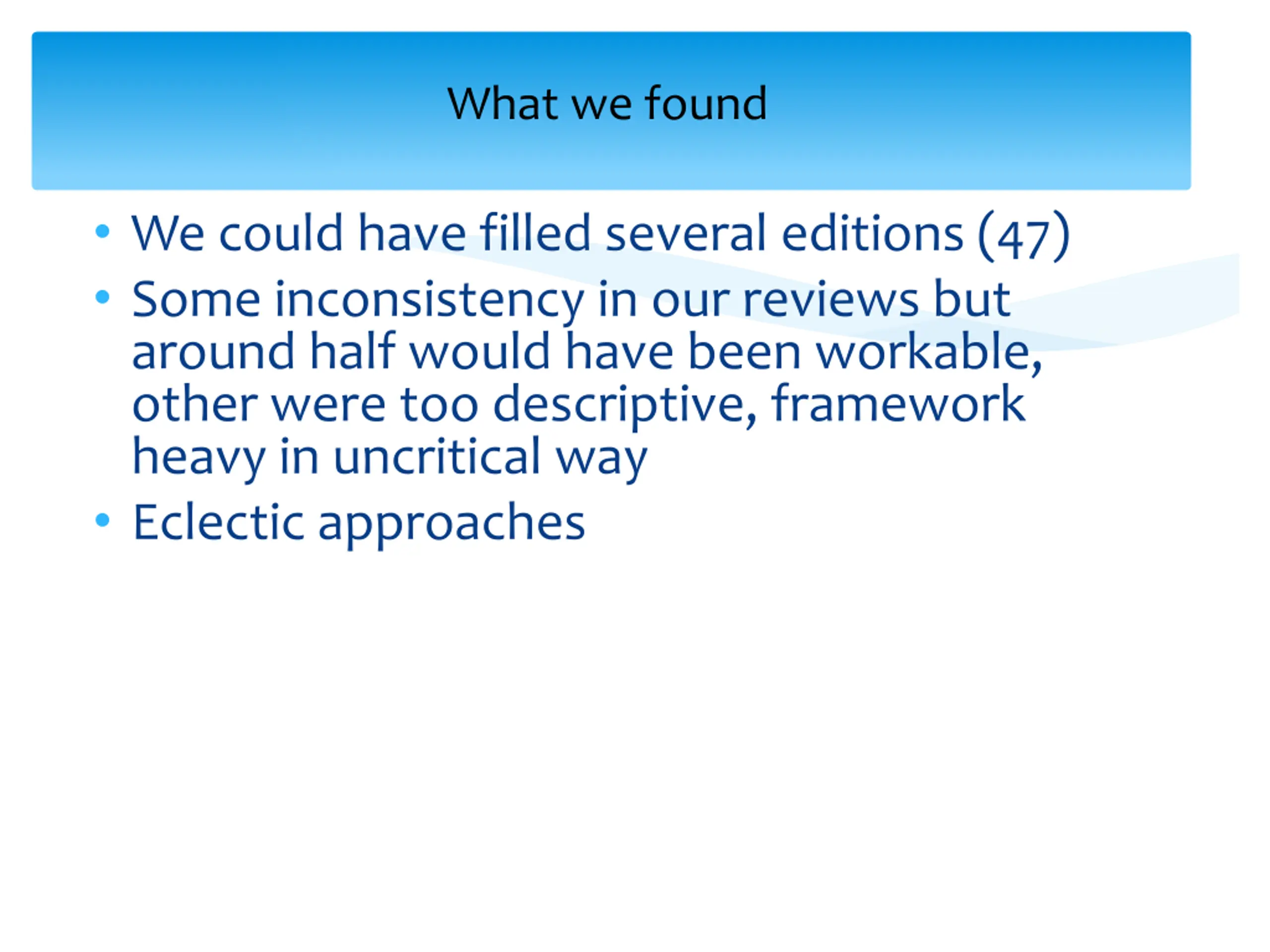 What we found We could have filled several editions (47) Some inconsistency in our reviews but around half would have been workable, other were too descriptive, framework heavy in uncritical way Eclectic approaches