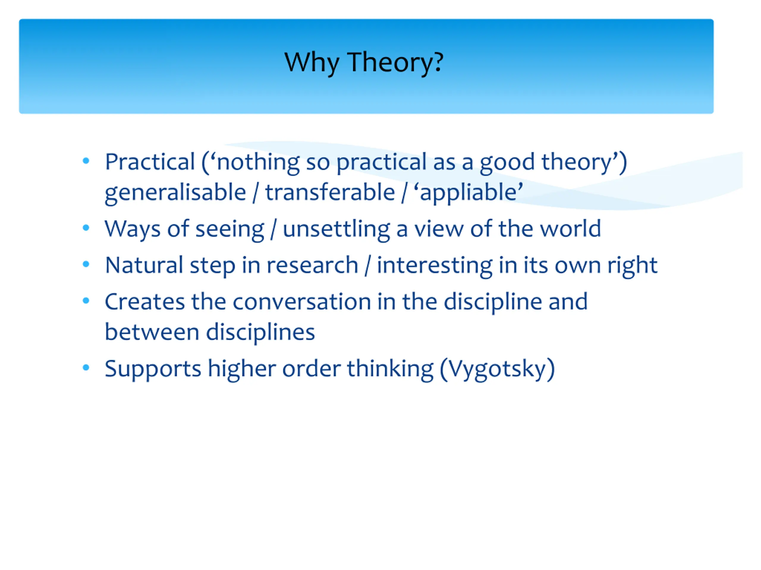 Why Theory? Practical ( nothing so practical as a good theory ) generalisable / transferable / appliable Ways of seeing / unsettling a view of the world Natural step in research / interesting in its own right Creates the conversation in the discipline and between disciplines Supports higher order thinking (Vygotsky)