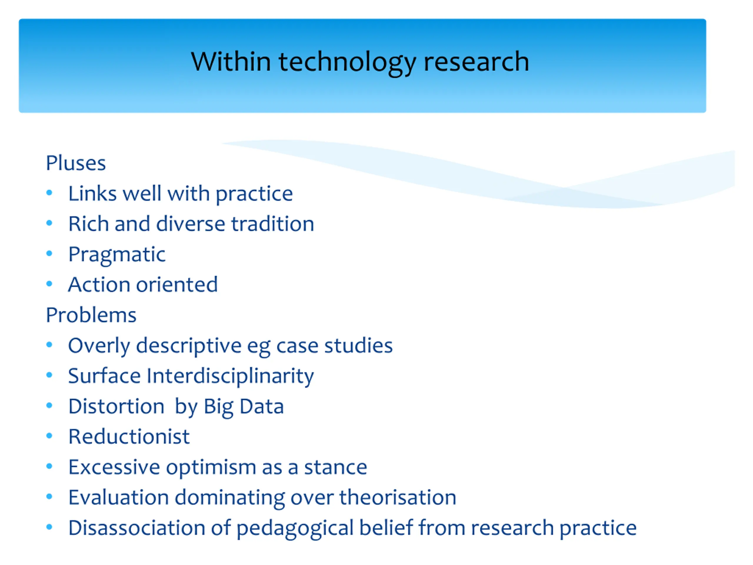 Within technology research Pluses Links well with practice Rich and diverse tradition Pragmatic Action oriented Problems Overly descriptive eg case studies Surface Interdisciplinarity Distortion by Big Data Reductionist Excessive optimism as a stance Evaluation dominating over theorisation Disassociation of pedagogical belief from research practice