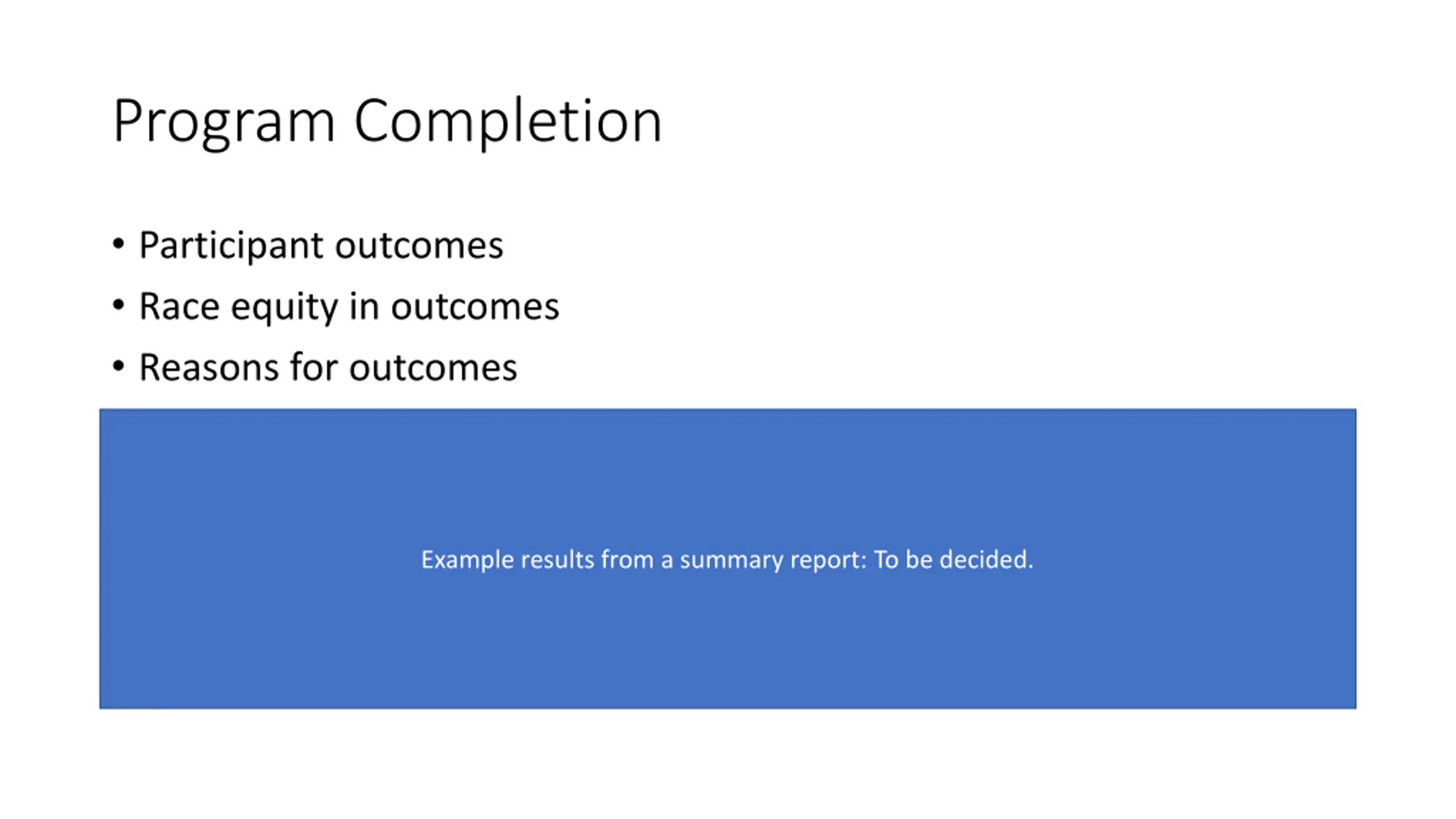 Program Completion Participant outcomes Race equity in outcomes Reasons for outcomes Example results from a summary report: To be decided.