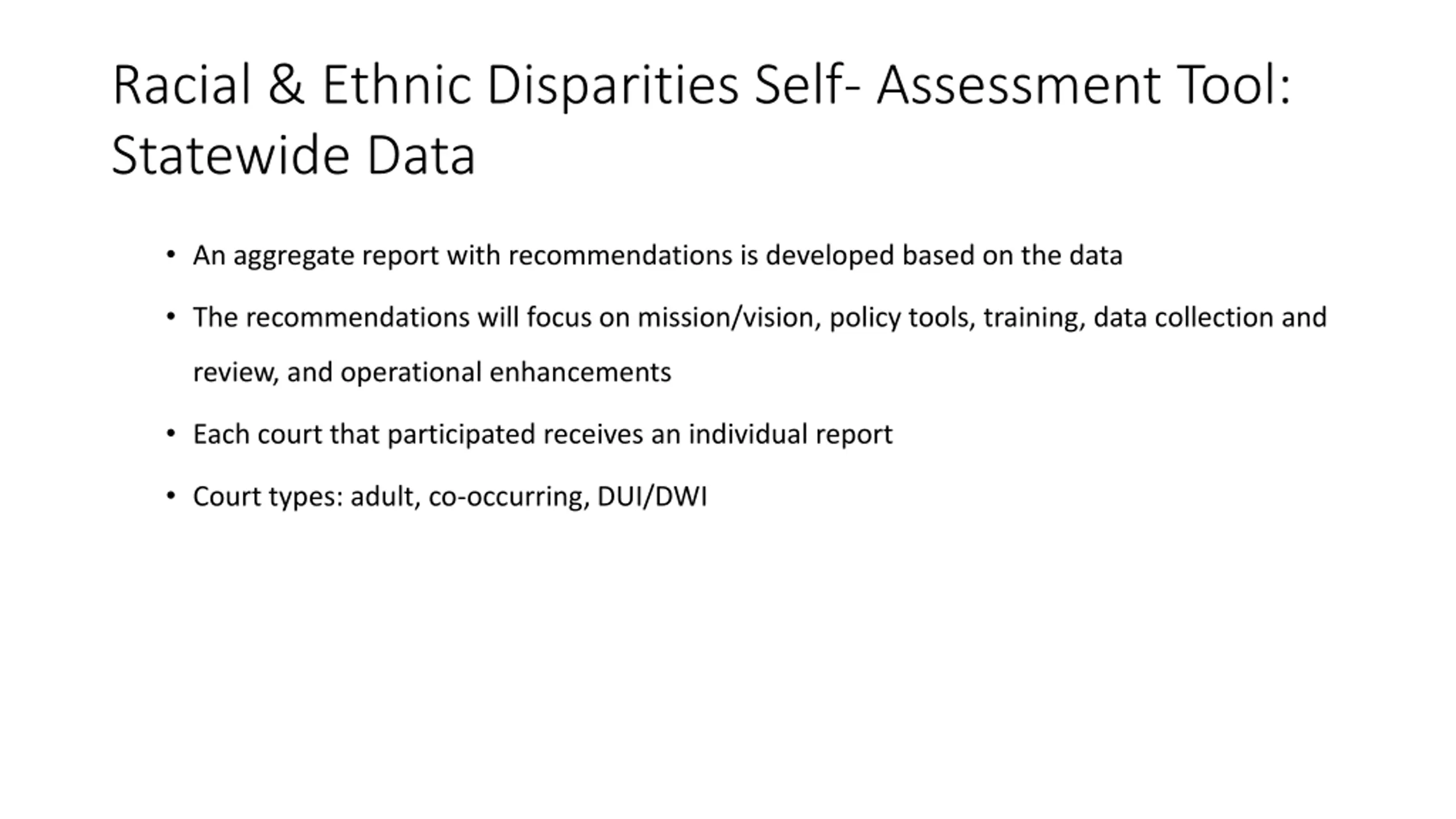 Racial & Ethnic Disparities Self- Assessment Tool: Statewide Data An aggregate report with recommendations is developed based on the data The recommendations will focus on mission/vision, policy tools, training, data collection and review, and operational enhancements Each court that participated receives an individual report Court types: adult, co-occurring, DUI/DWI