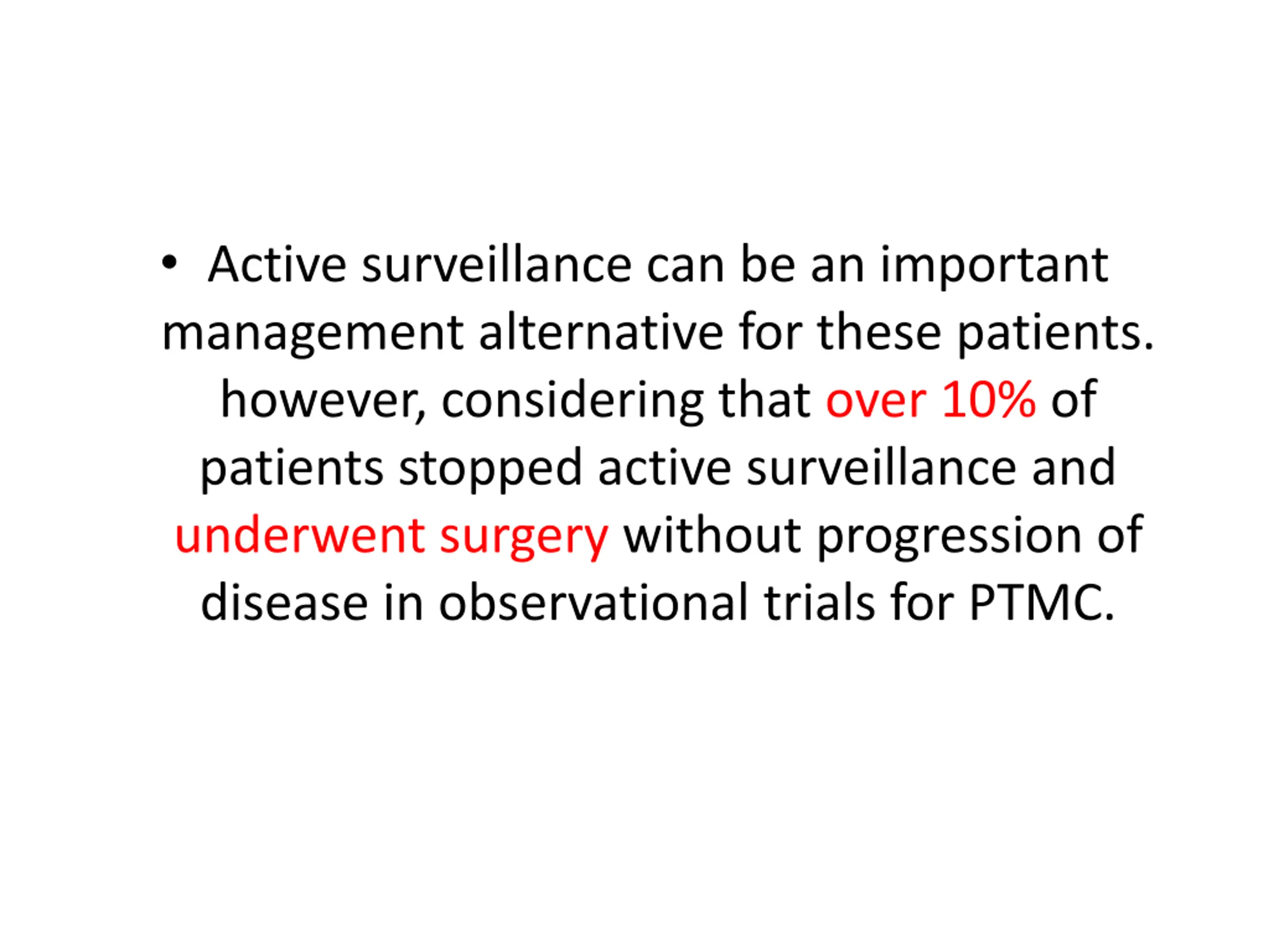 Active surveillance can be an important management alternative for these patients. however, considering that over 10% of patients stopped active surveillance and underwent surgery without progression of disease in observational trials for PTMC.