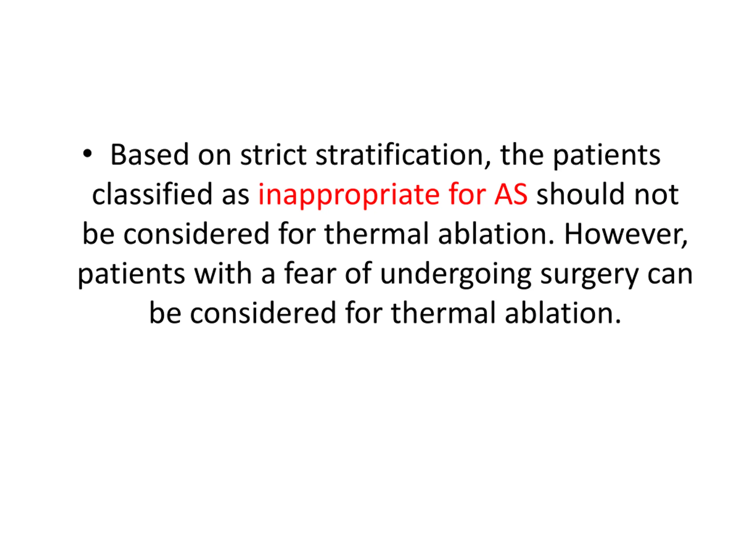 Based on strict stratification, the patients classified as inappropriate for AS should not be considered for thermal ablation. However, patients with a fear of undergoing surgery can be considered for thermal ablation.