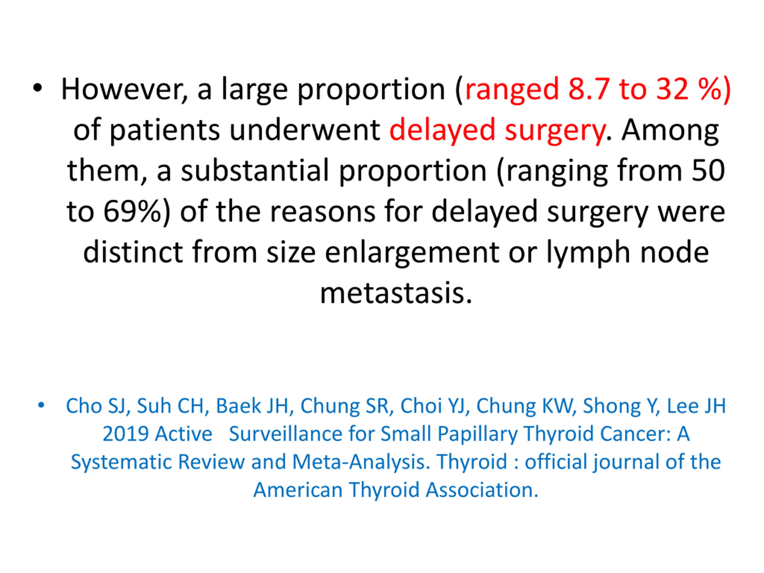 However, a large proportion (ranged 8.7 to 32 %) of patients underwent delayed surgery. Among them, a substantial proportion (ranging from 50 to 69%) of the reasons for delayed surgery were distinct from size enlargement or lymph node metastasis. Cho SJ, Suh CH, Baek JH, Chung SR, Choi YJ, Chung KW, Shong Y, Lee JH 2019 Active Surveillance for Small Papillary Thyroid Cancer: A Systematic Review and Meta Analysis. Thyroid : official journal of the American Thyroid Association.