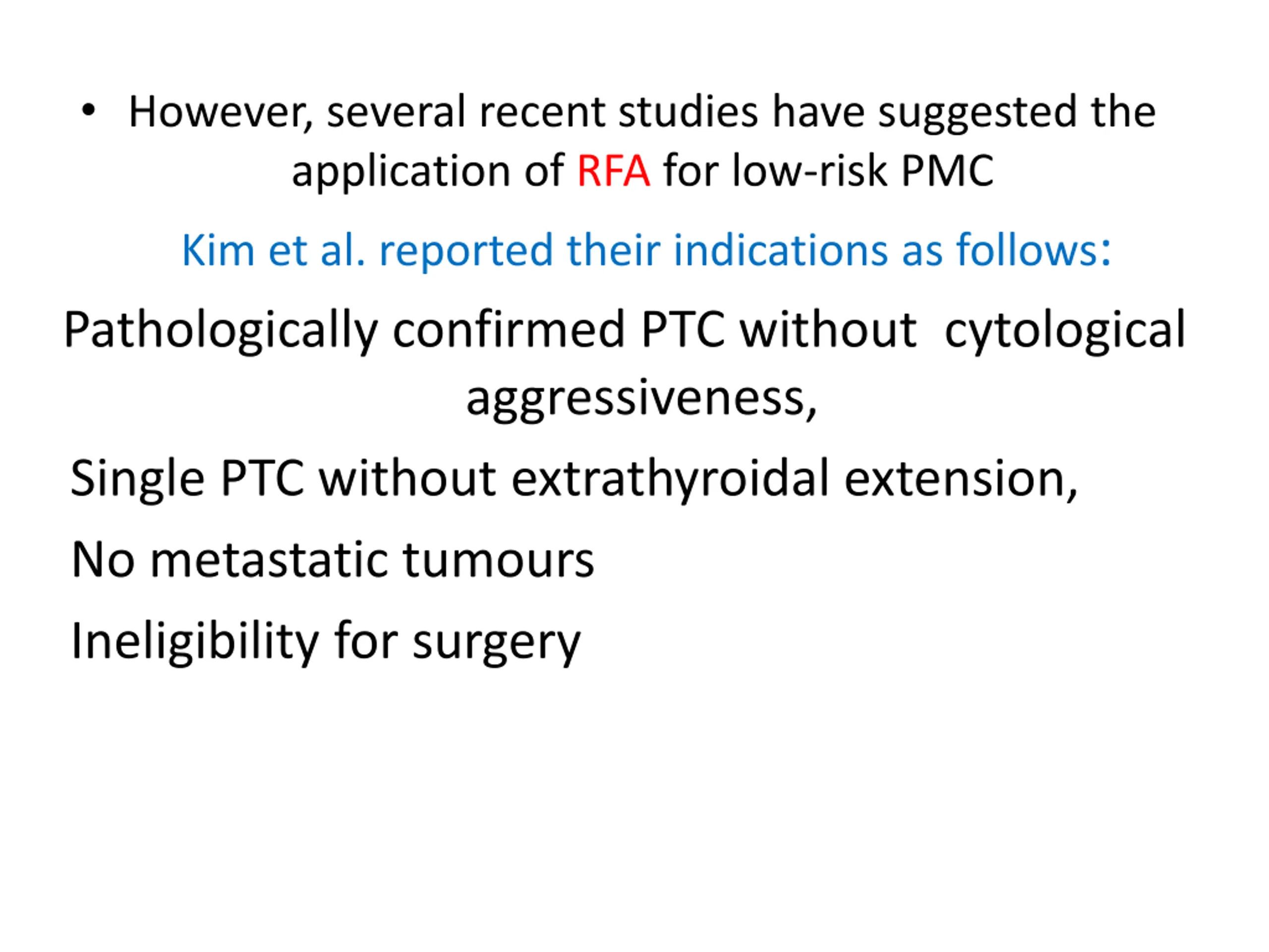 However, several recent studies have suggested the application of RFA for low-risk PMC Kim et al. reported their indications as follows: Pathologically confirmed PTC without cytological aggressiveness, Single PTC without extrathyroidal extension, No metastatic tumours Ineligibility for surgery